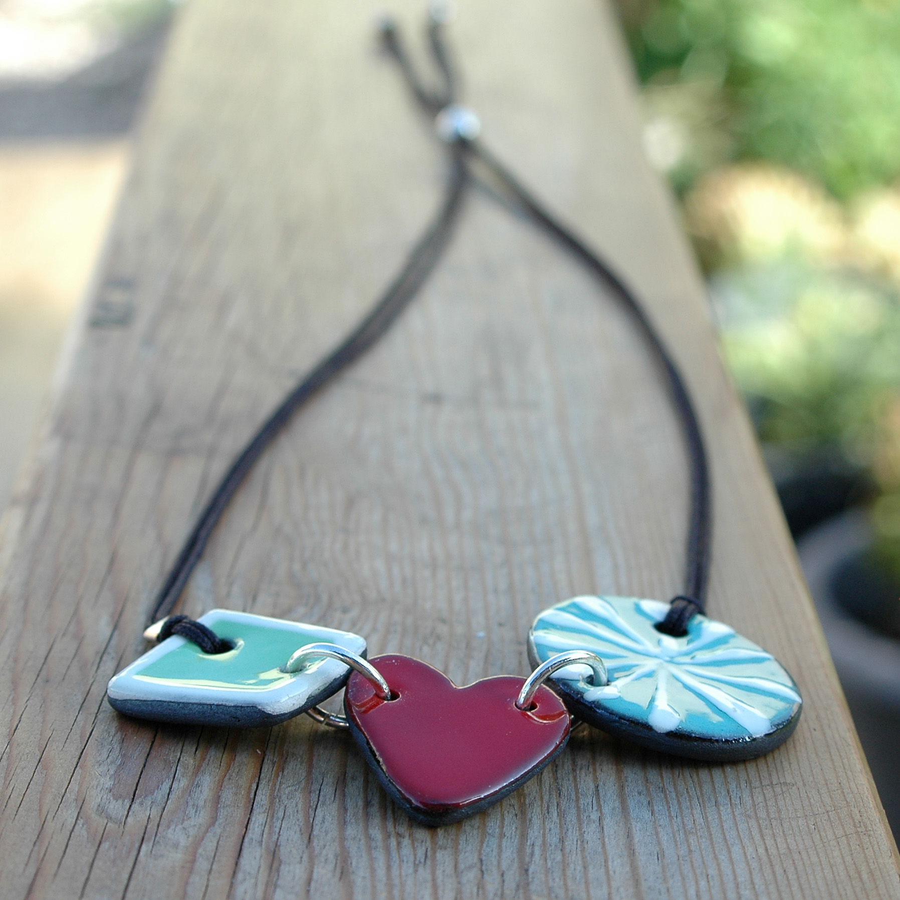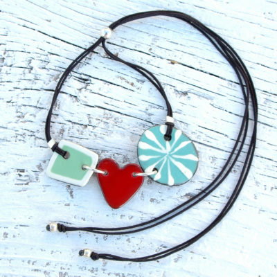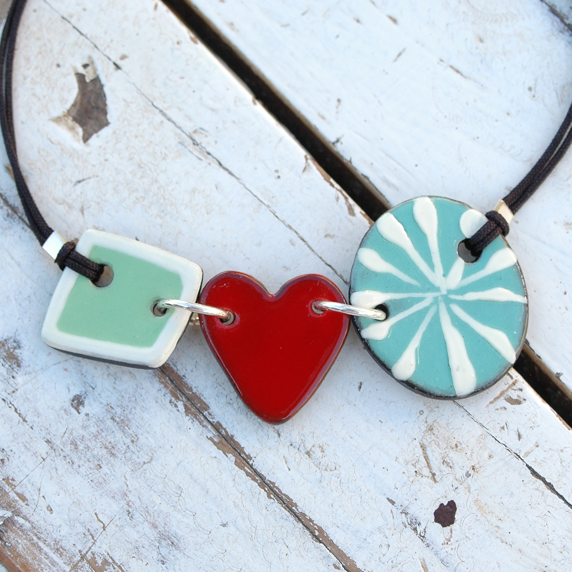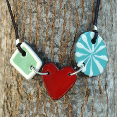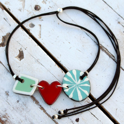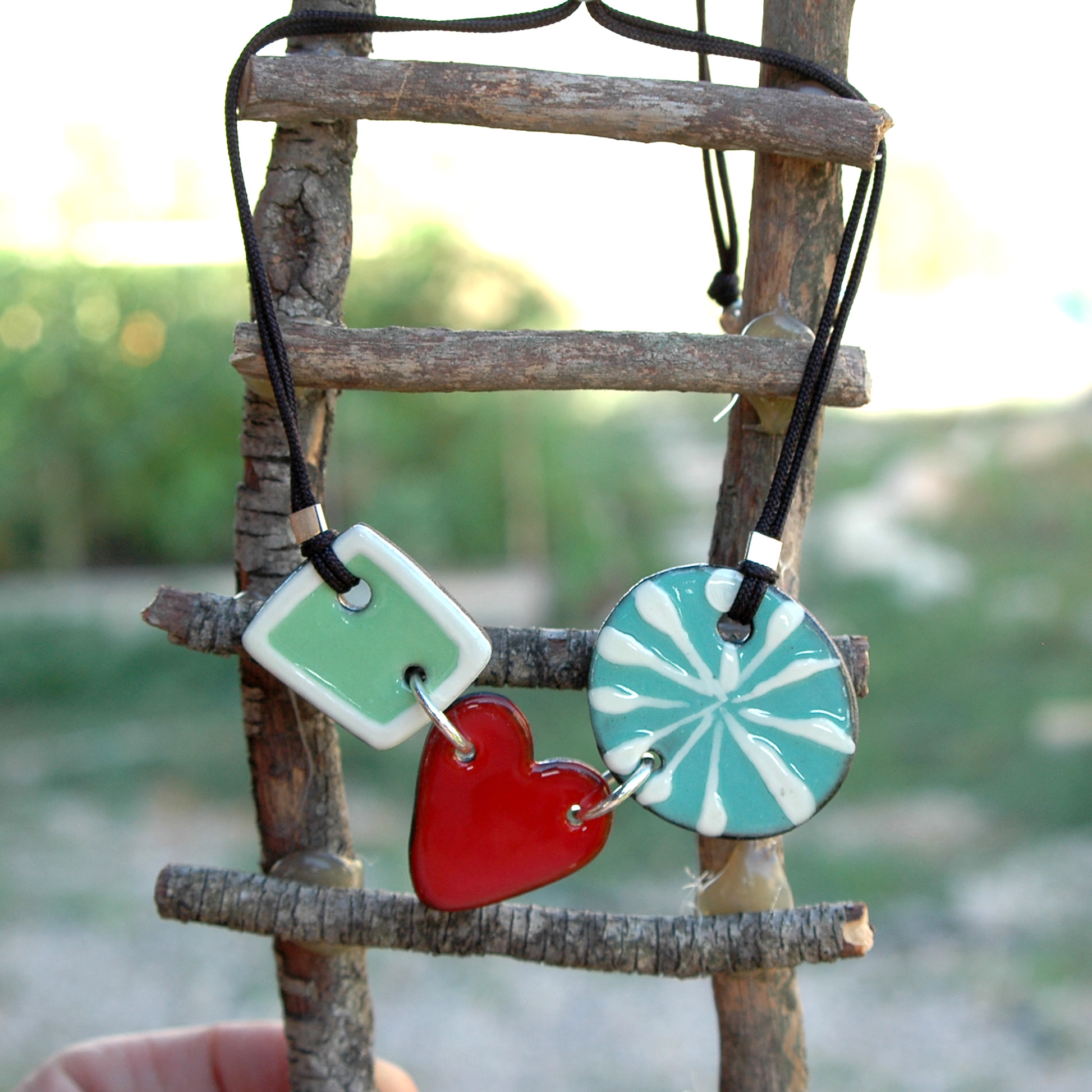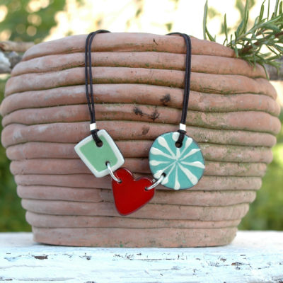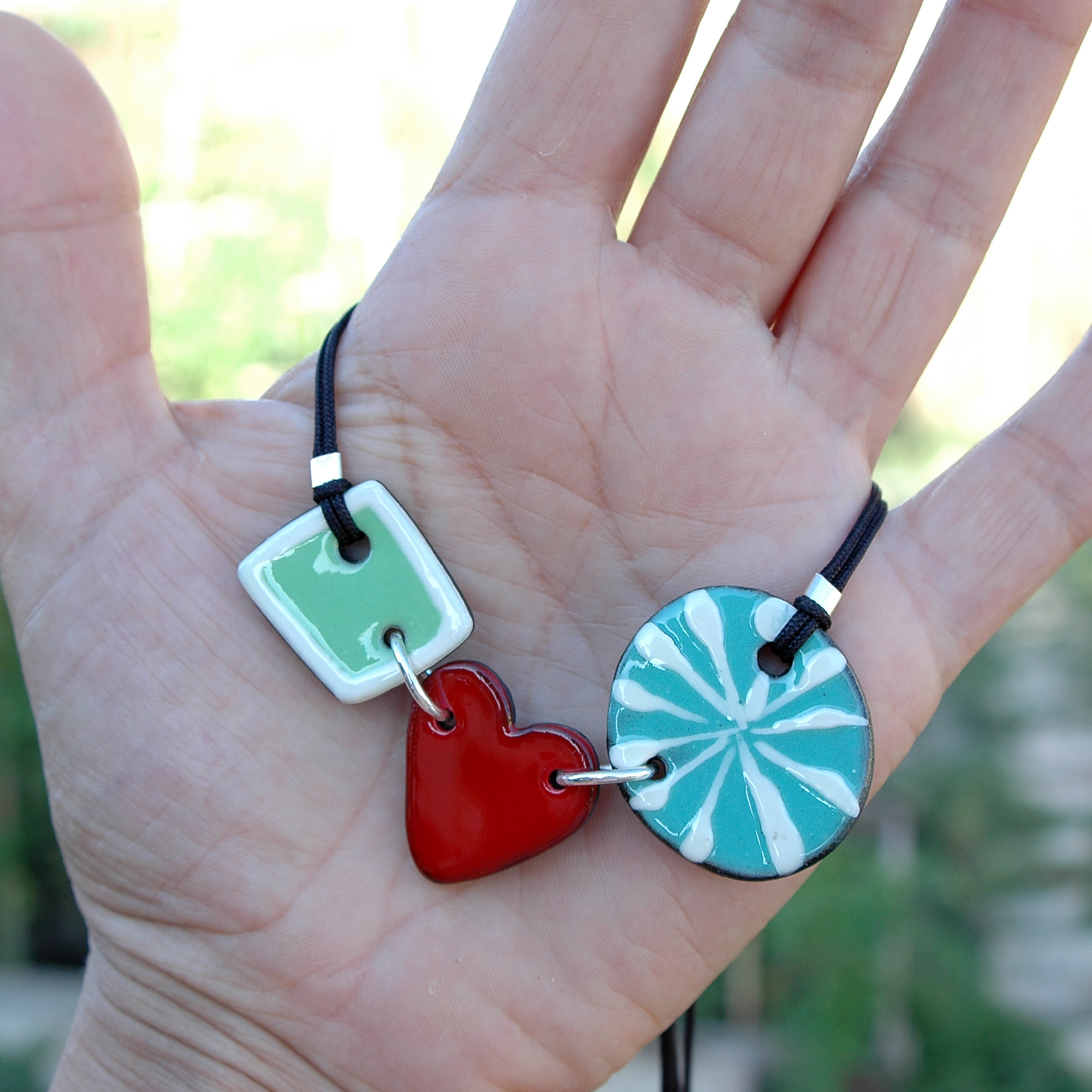 Esta bonita gargantilla lucirá original en tu escote. Me gusta combinar el color rojo y verde creando un estilo fresco e innovador. Esta joya está compuesta por tres piezas de cerámica unidas por grandes anillas de plata de Ley, dos de las piezas son de color verde (verde menta y verde agua) resaltadas con un atrevido corazón rojo central. Ligera y cómoda. El cordón es de nylon duradero y su cierre es ajustable mediante una bola de plata. Cada extremo del cordón tiene una pequeña bolita de plata hipoalergénica. Creativa, pintada a mano y muy exclusiva. Atrévete a lucirla!!. Una pieza llena de amor única y mediterránea.