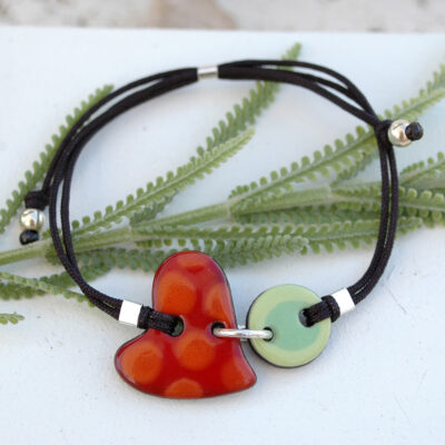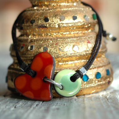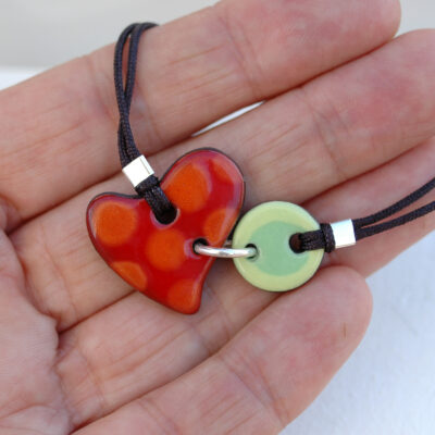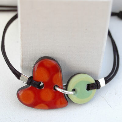 Compuesta por un corazón rojo con lunares naranjas y una pieza redonda verde lima unida por una anilla de plata. El cordón fabricado en nailon tiene pequeñas bolitas de plata en los extremos. El sistema de cierre es ajustable. Utilizo arcilla negra y esmaltes cerámicos.