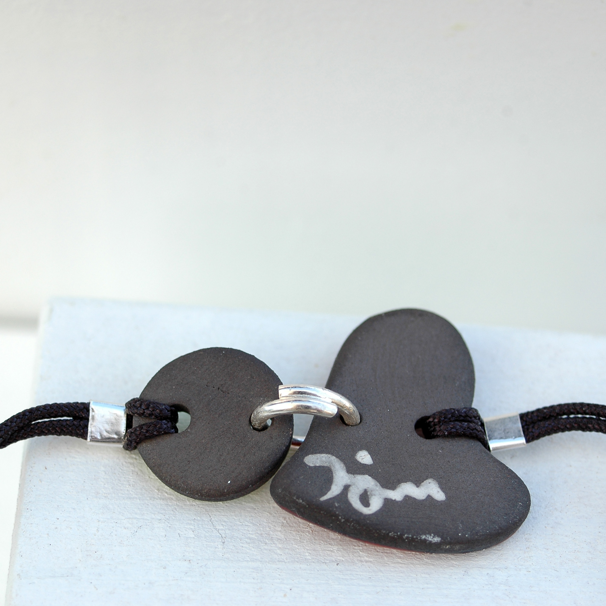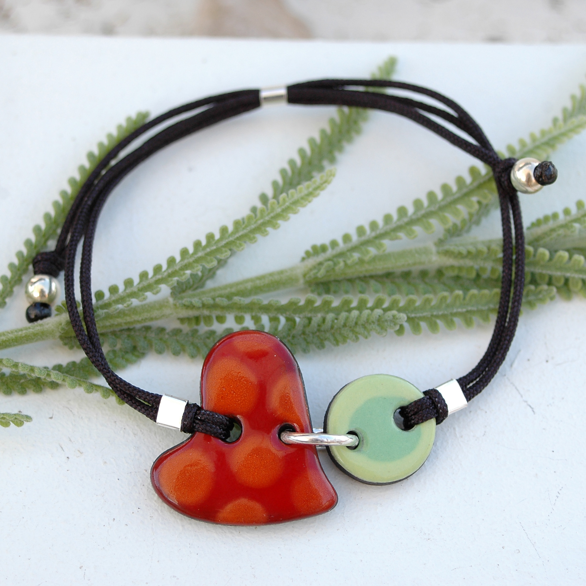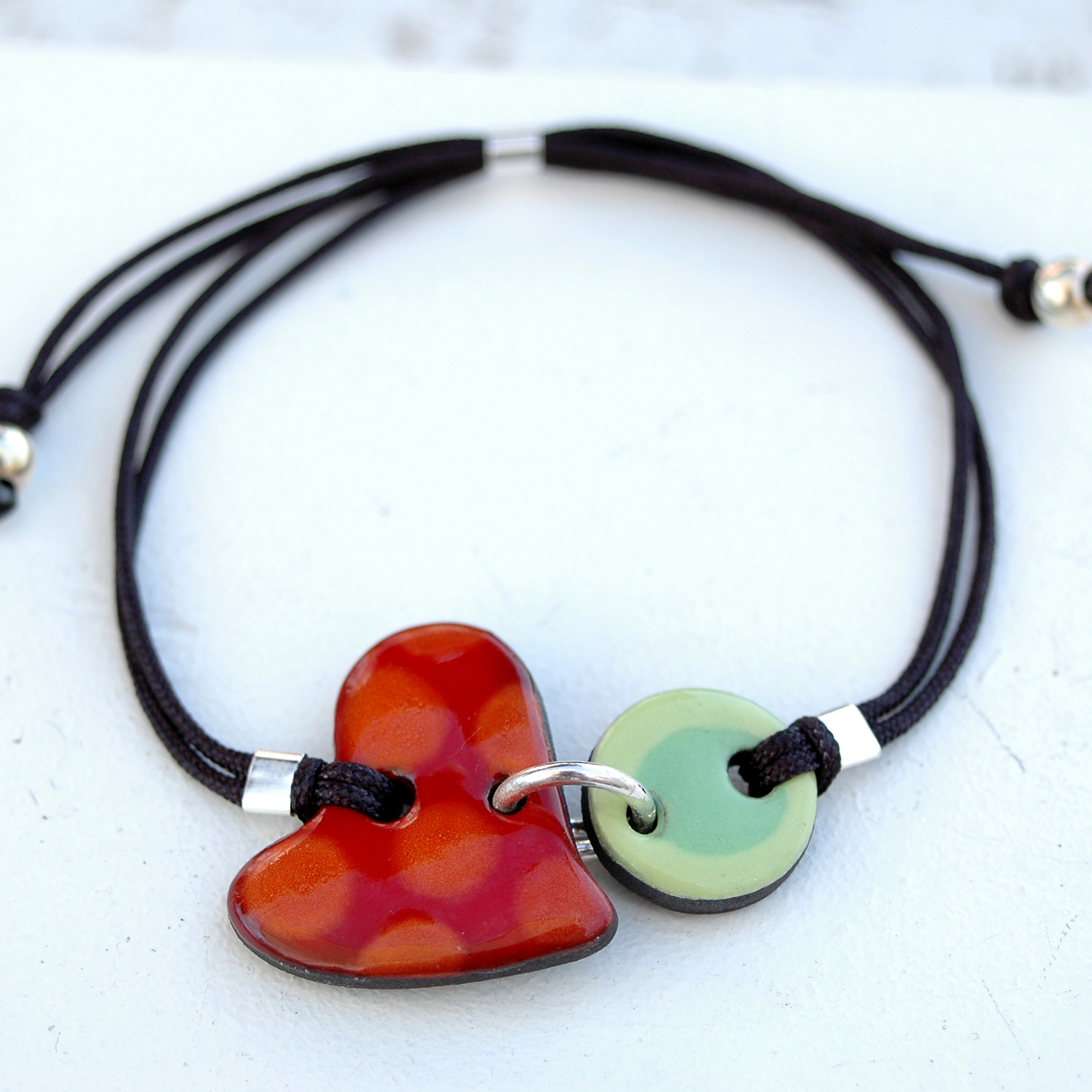 Compuesta por un corazón rojo con lunares naranjas y una pieza redonda verde lima unida por una anilla de plata. El cordón fabricado en nailon tiene pequeñas bolitas de plata en los extremos. El sistema de cierre es ajustable. Utilizo arcilla negra y esmaltes cerámicos.