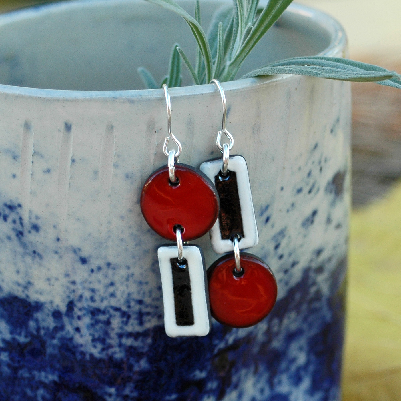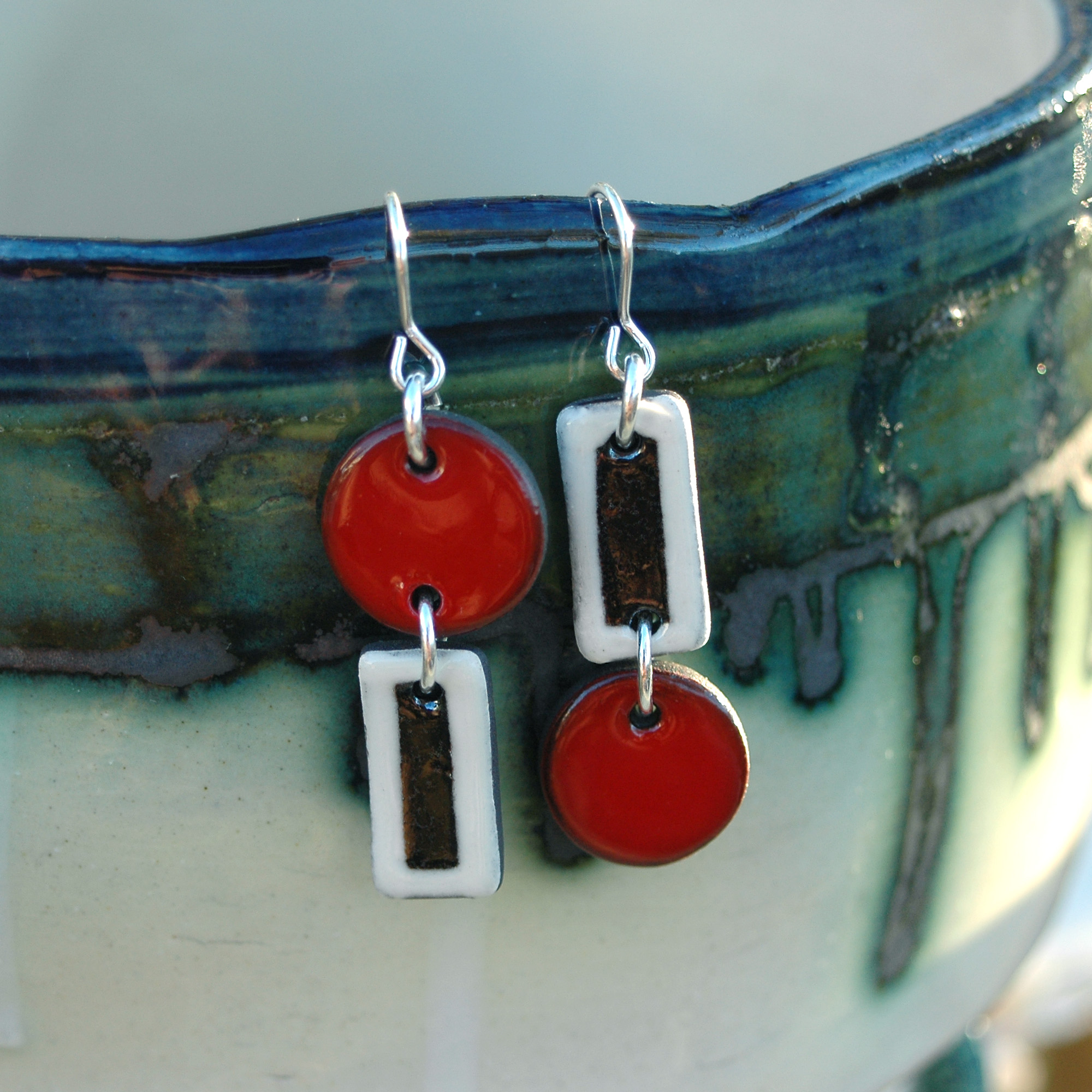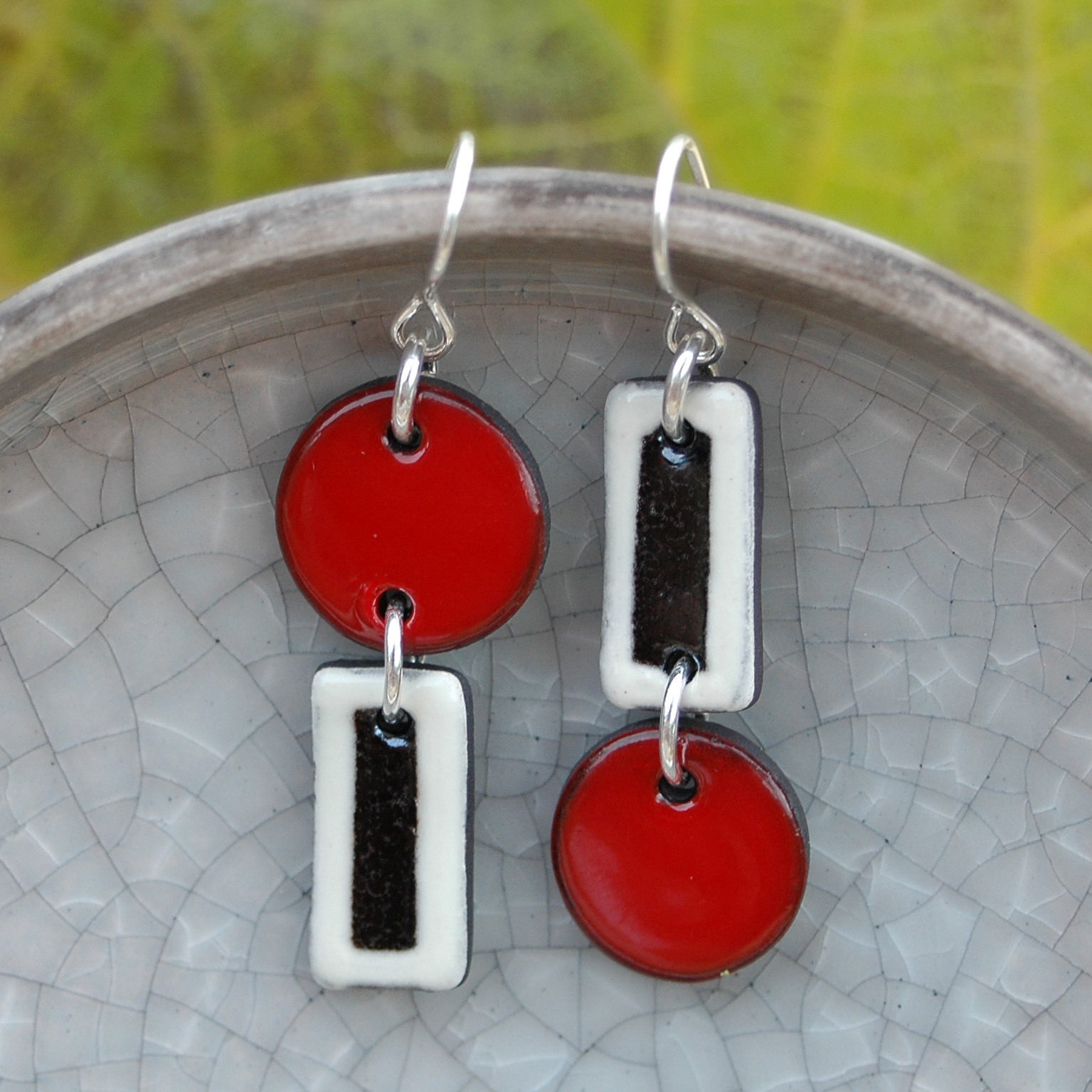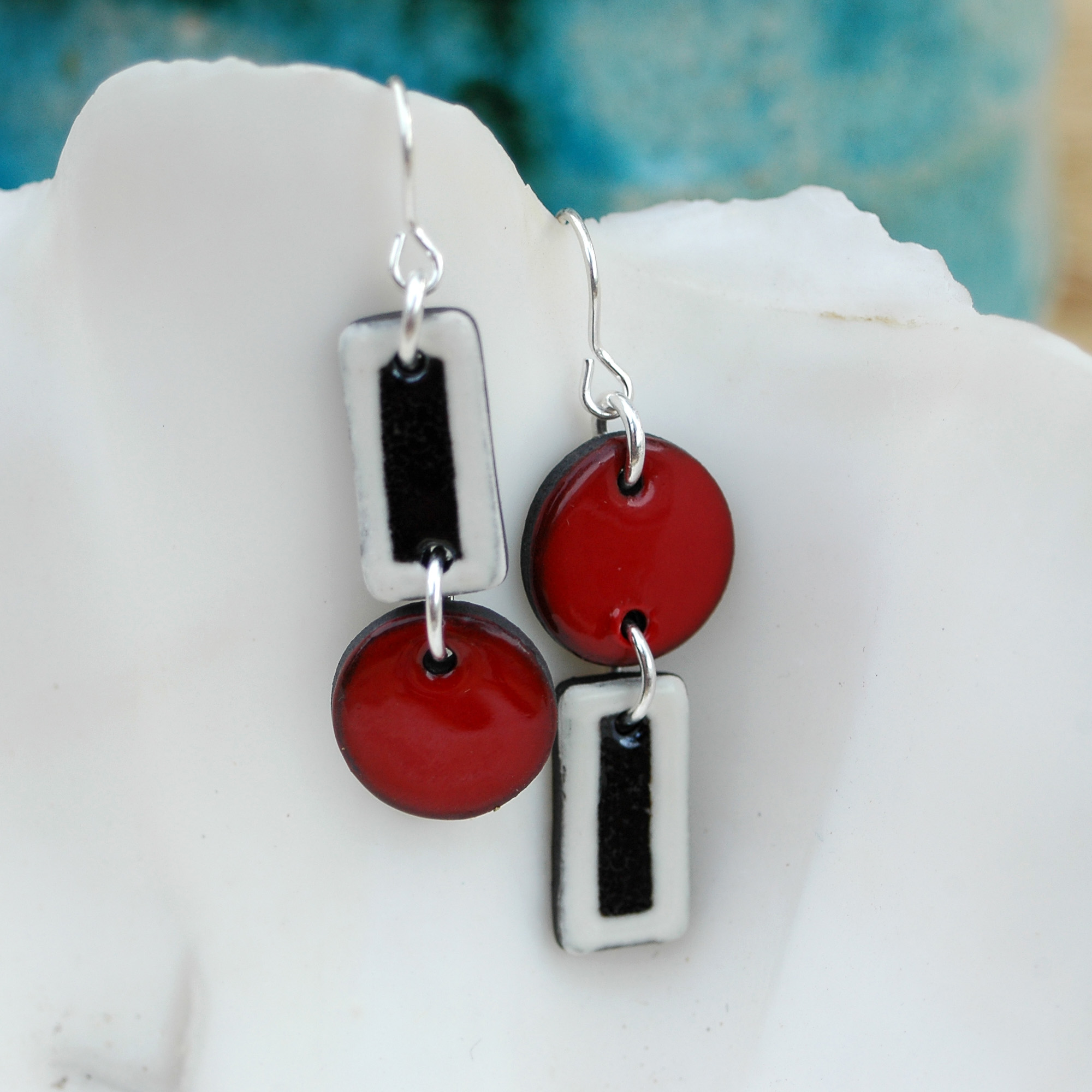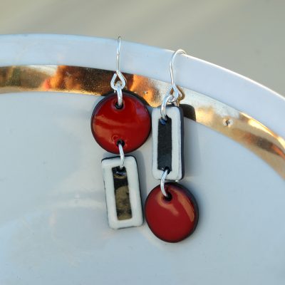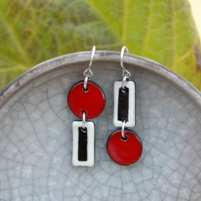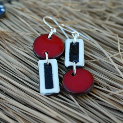 Pendiente de dos piezas en rojo, blanco y negro.