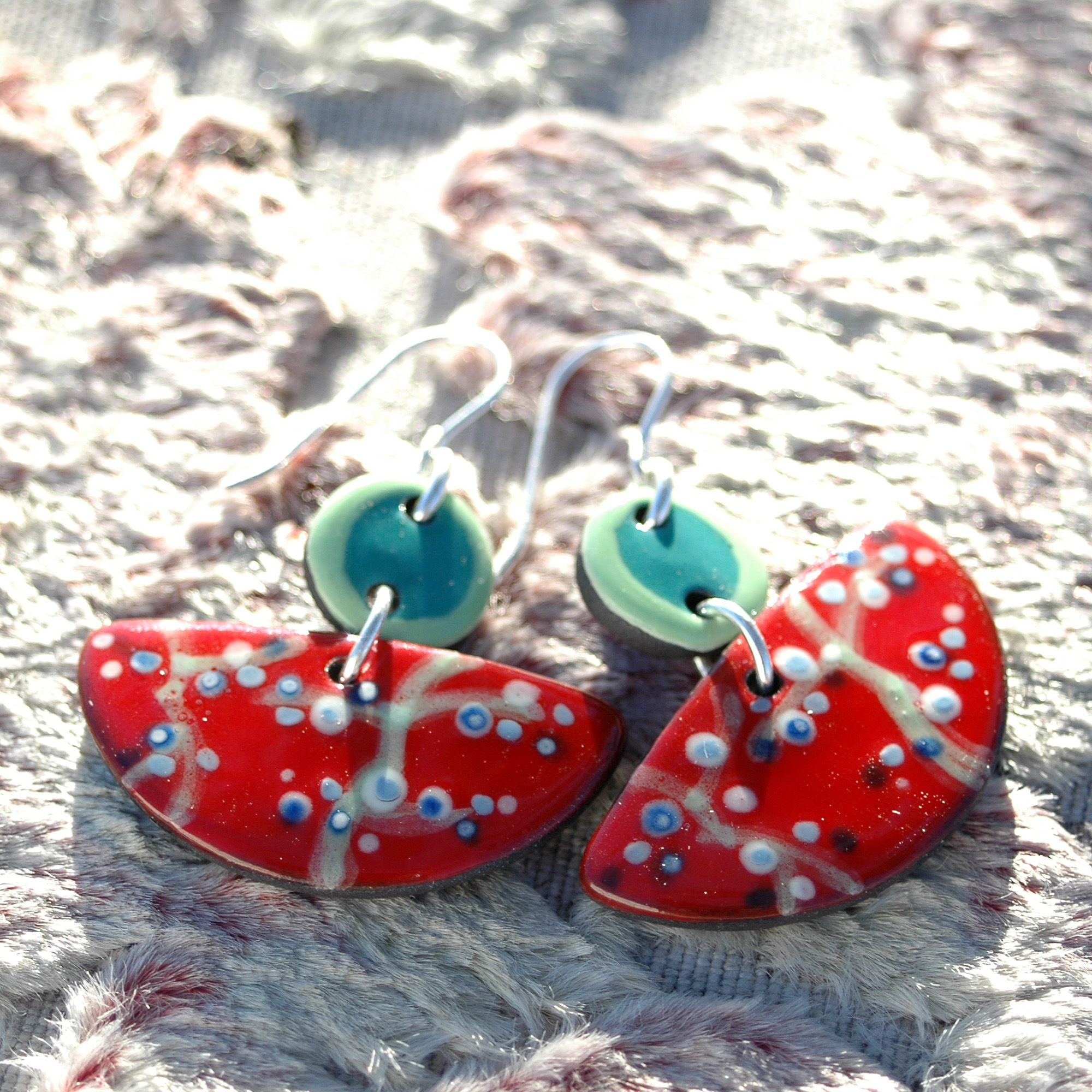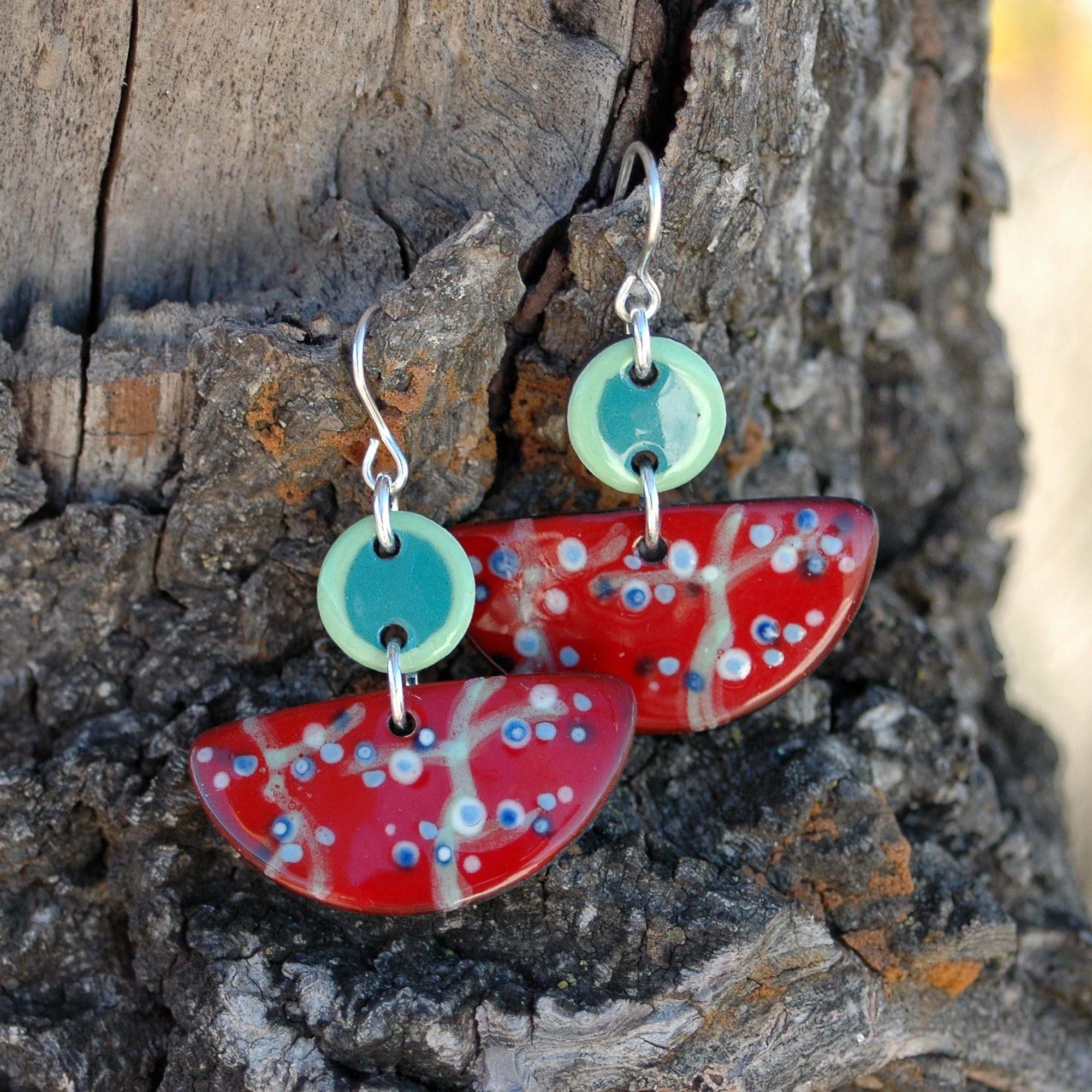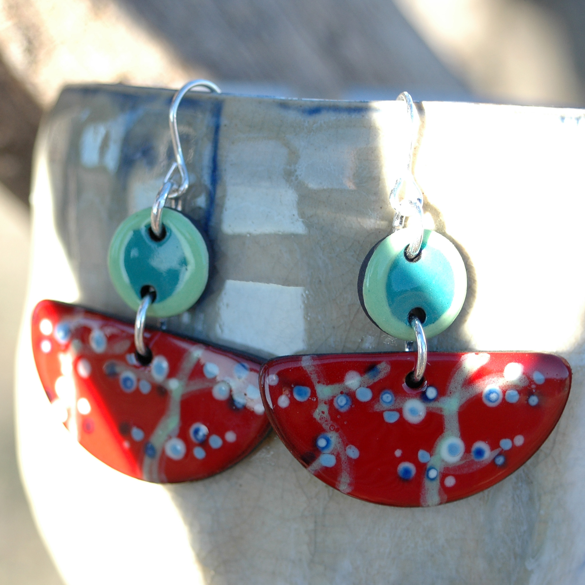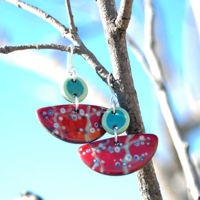 Pendiente rojo y verde de dos piezas en forma de Abanico. Metales en plata de Ley.
