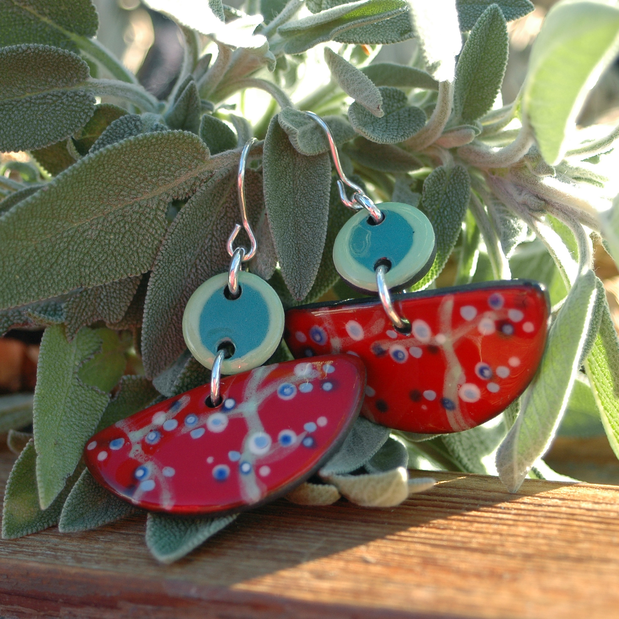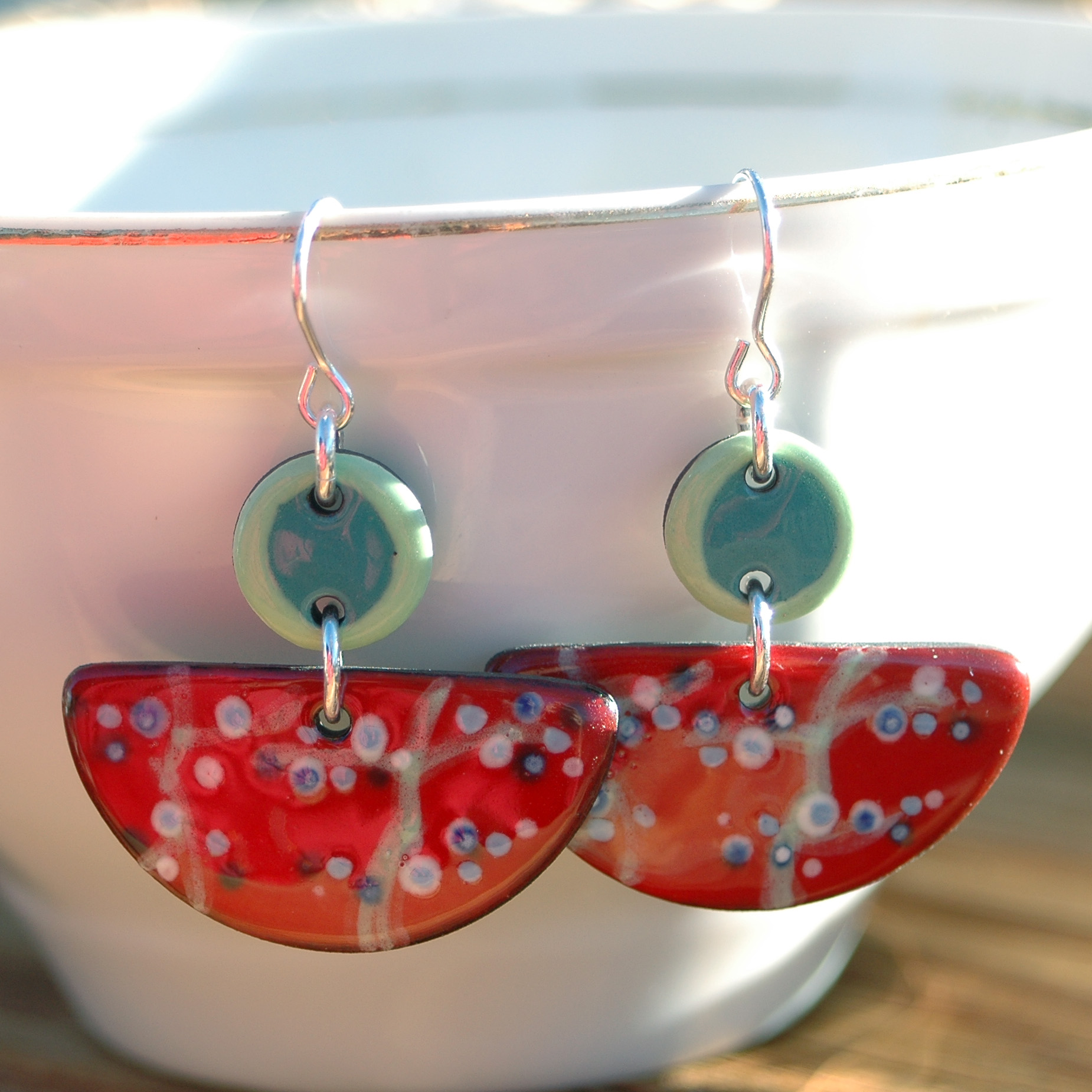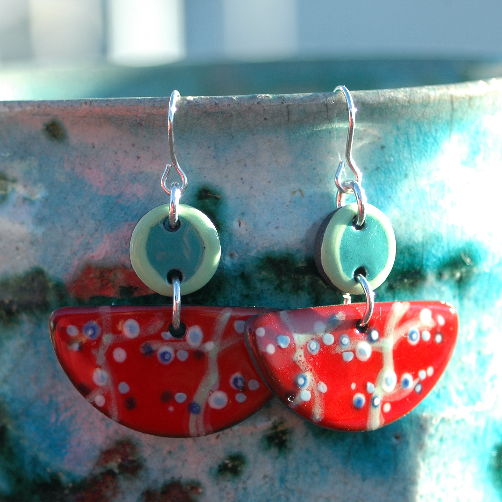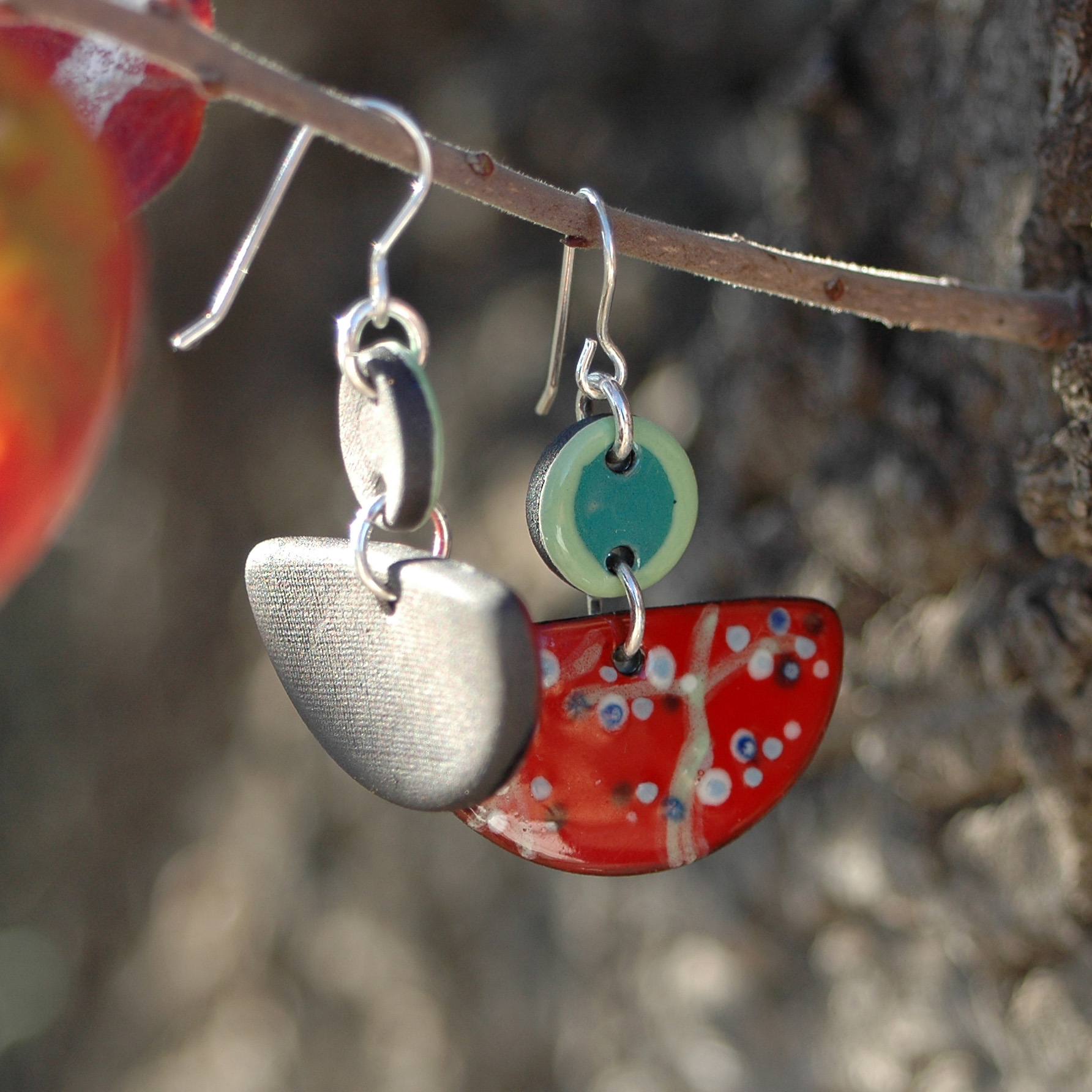 Pendiente rojo y verde de dos piezas en forma de Abanico. Metales en plata de Ley.