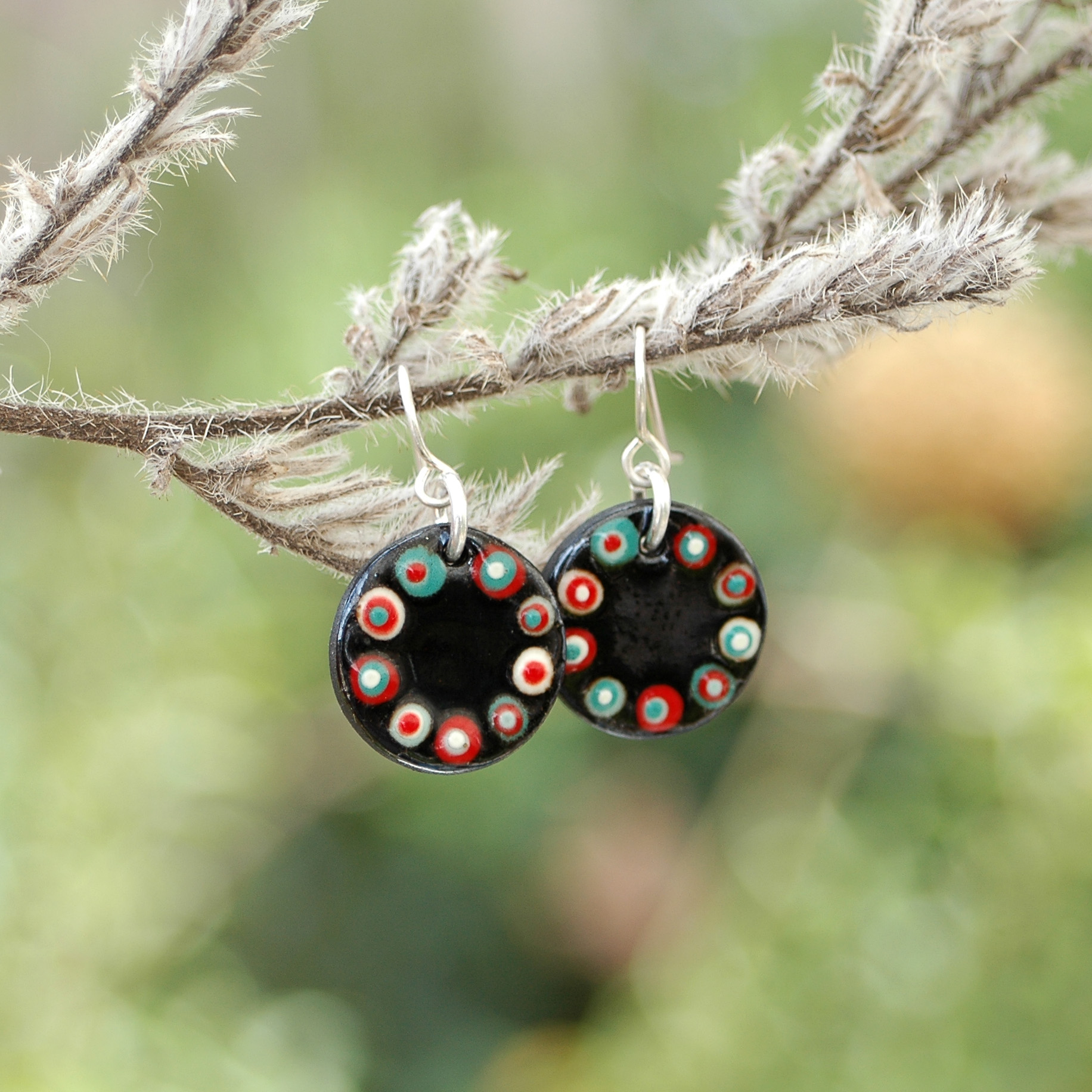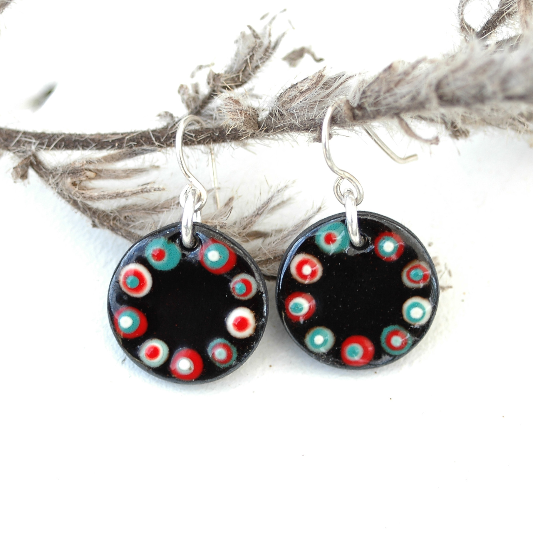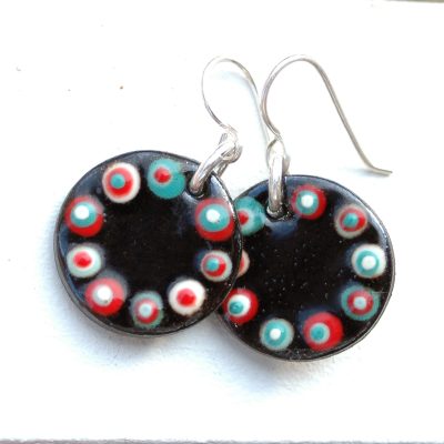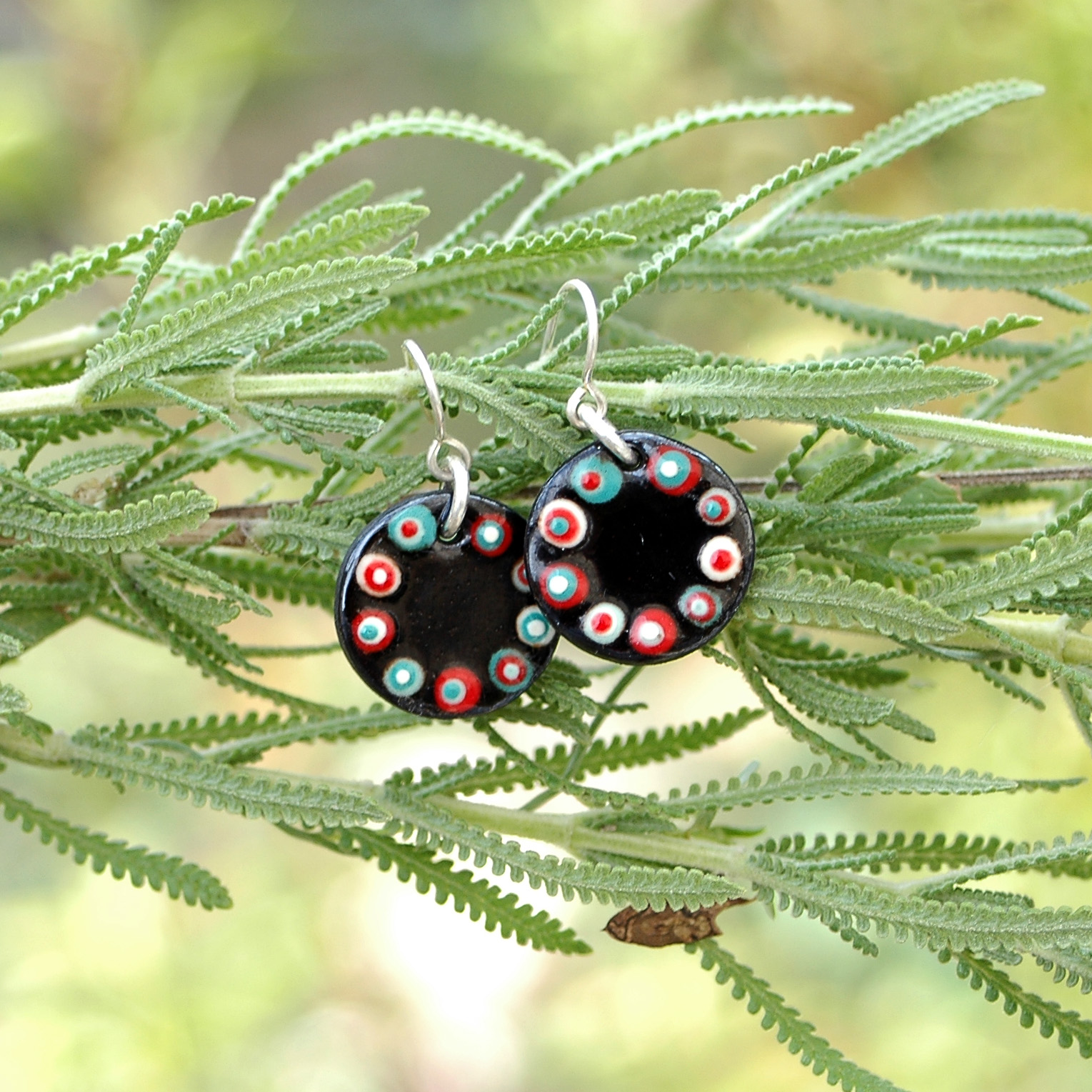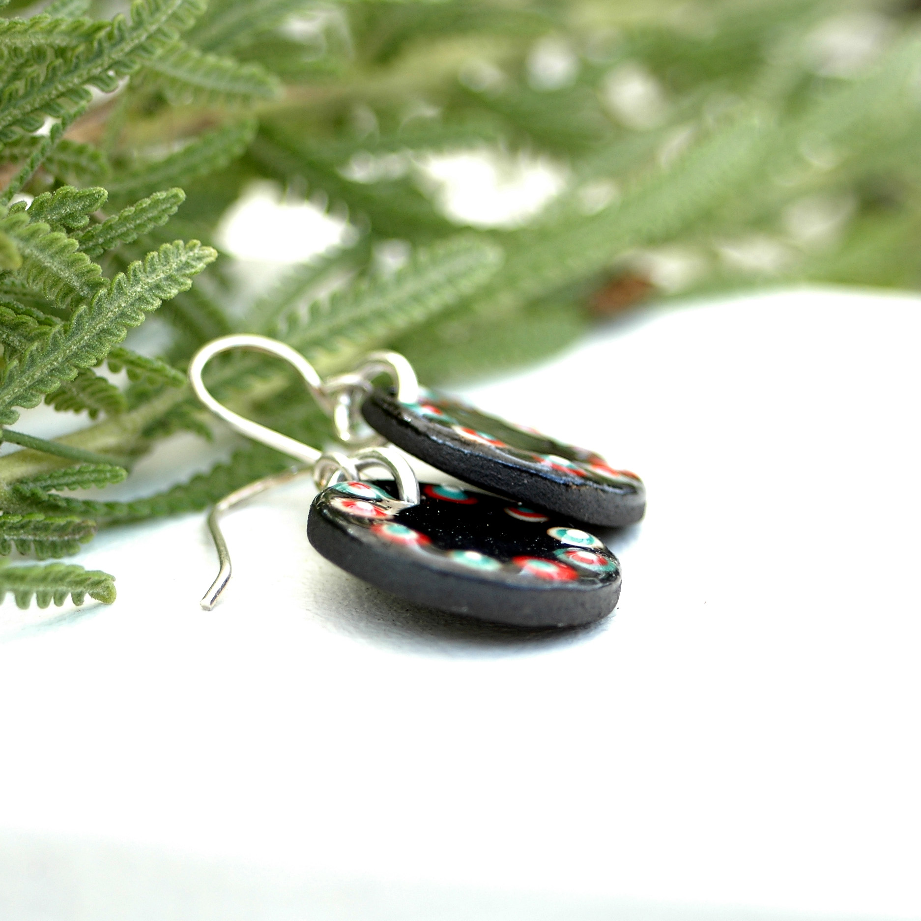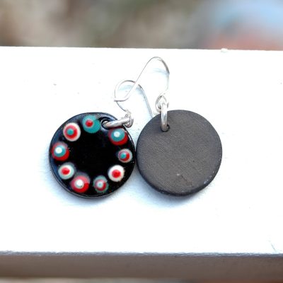 Pendiente de una pieza redondo de color negro. Metales: Plata de Ley.