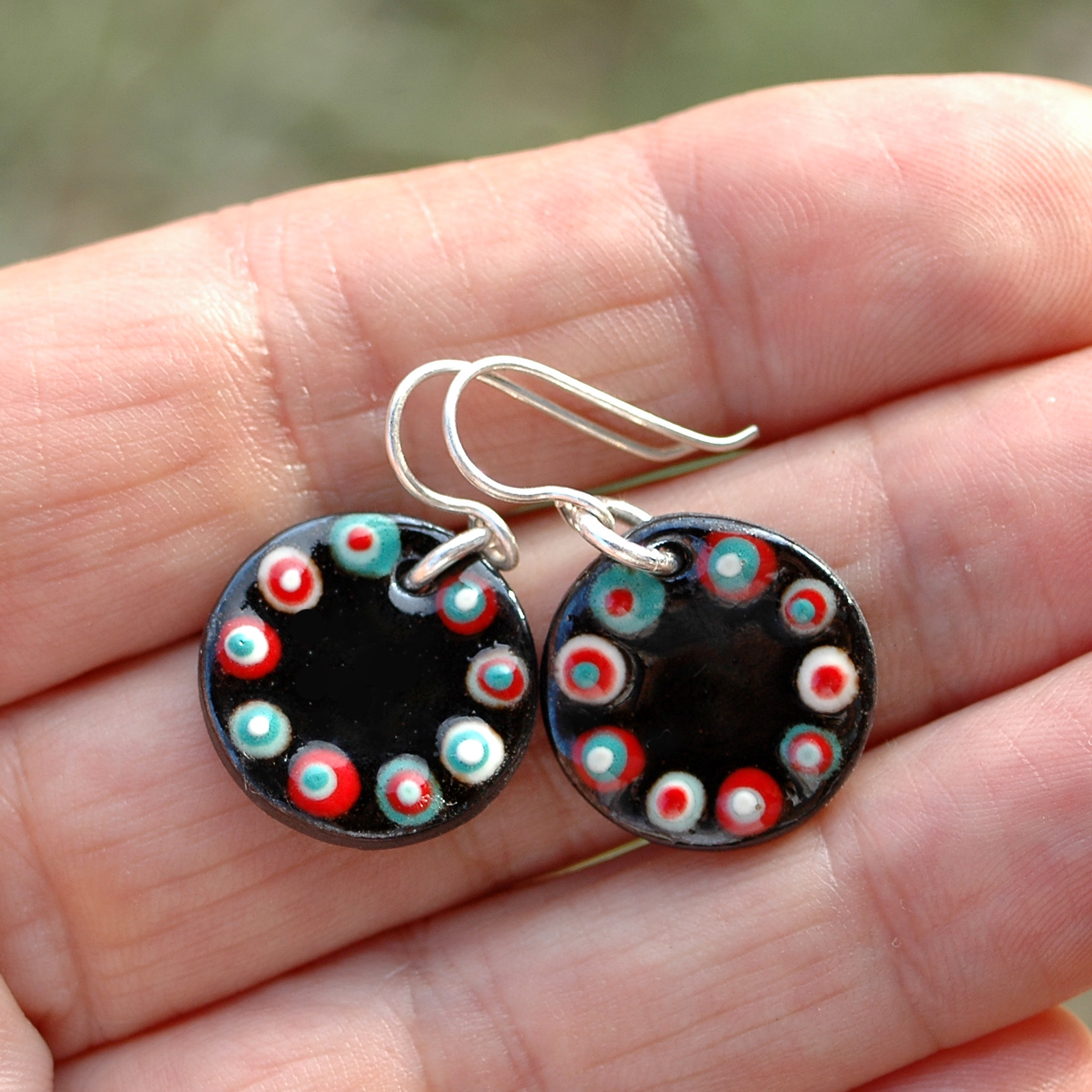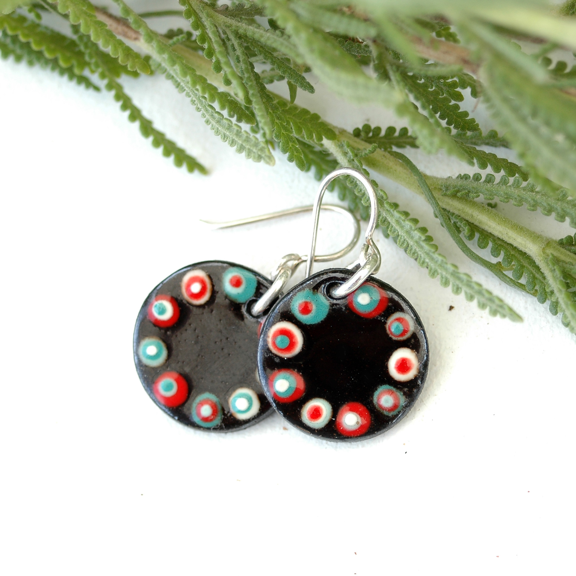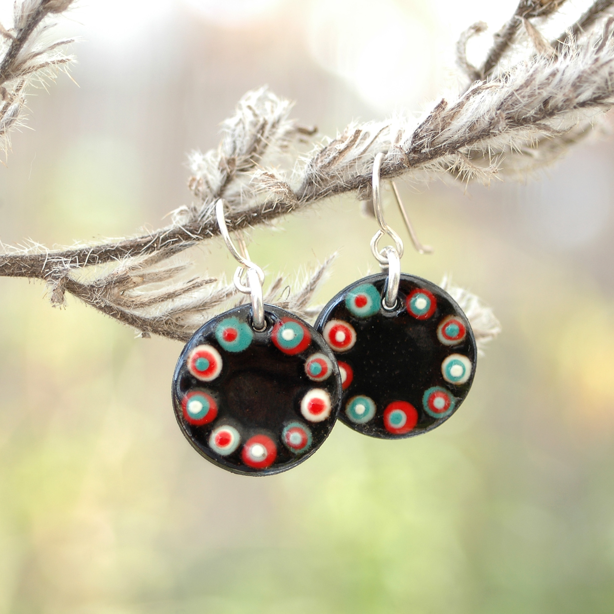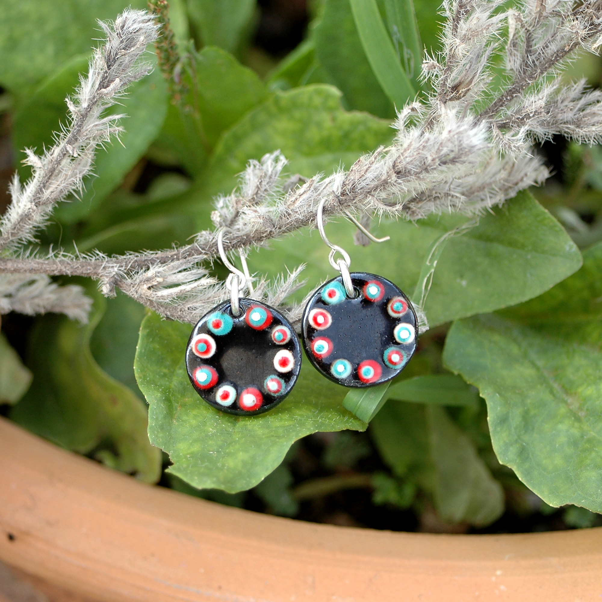 Pendiente de una pieza redondo de color negro. Metales: Plata de Ley.
