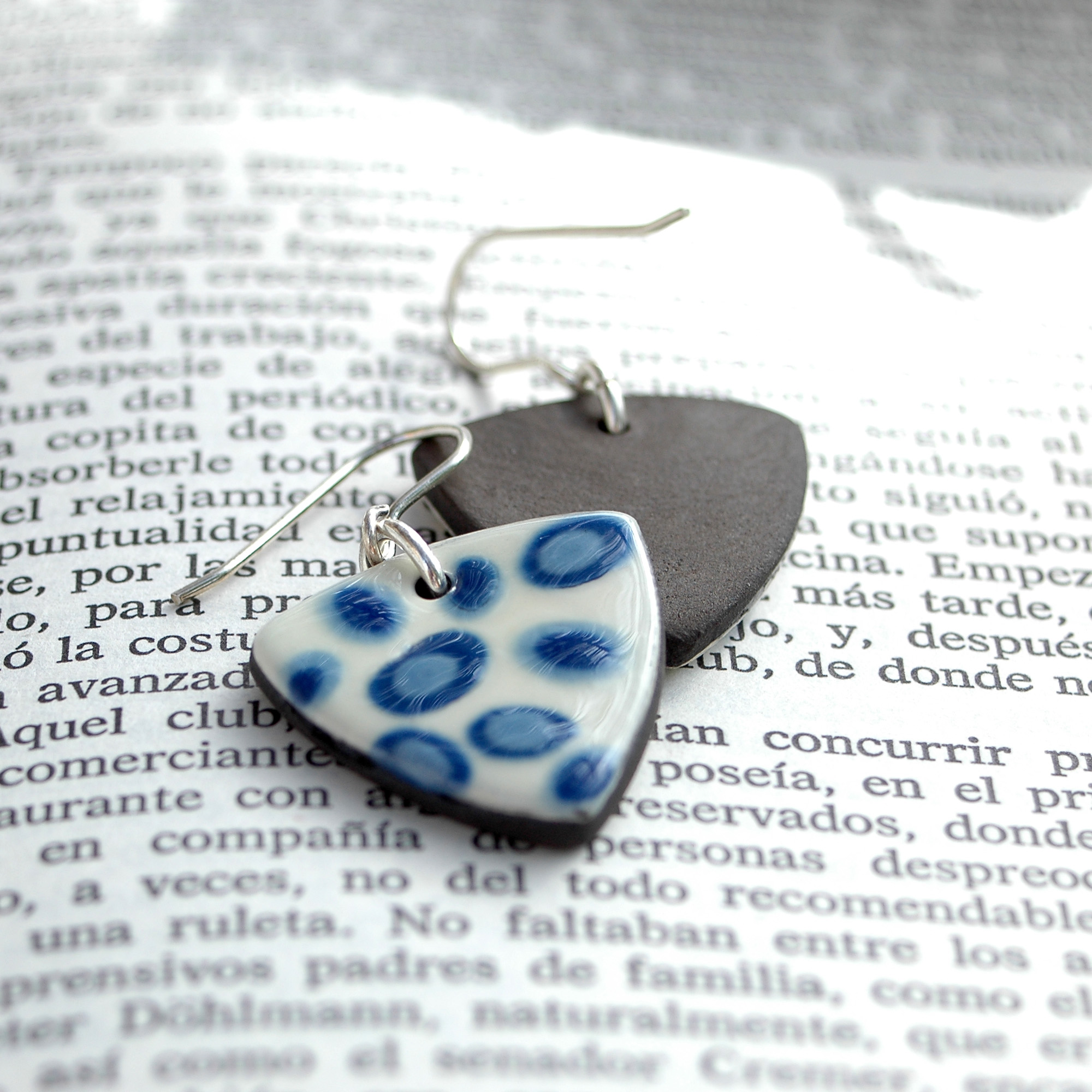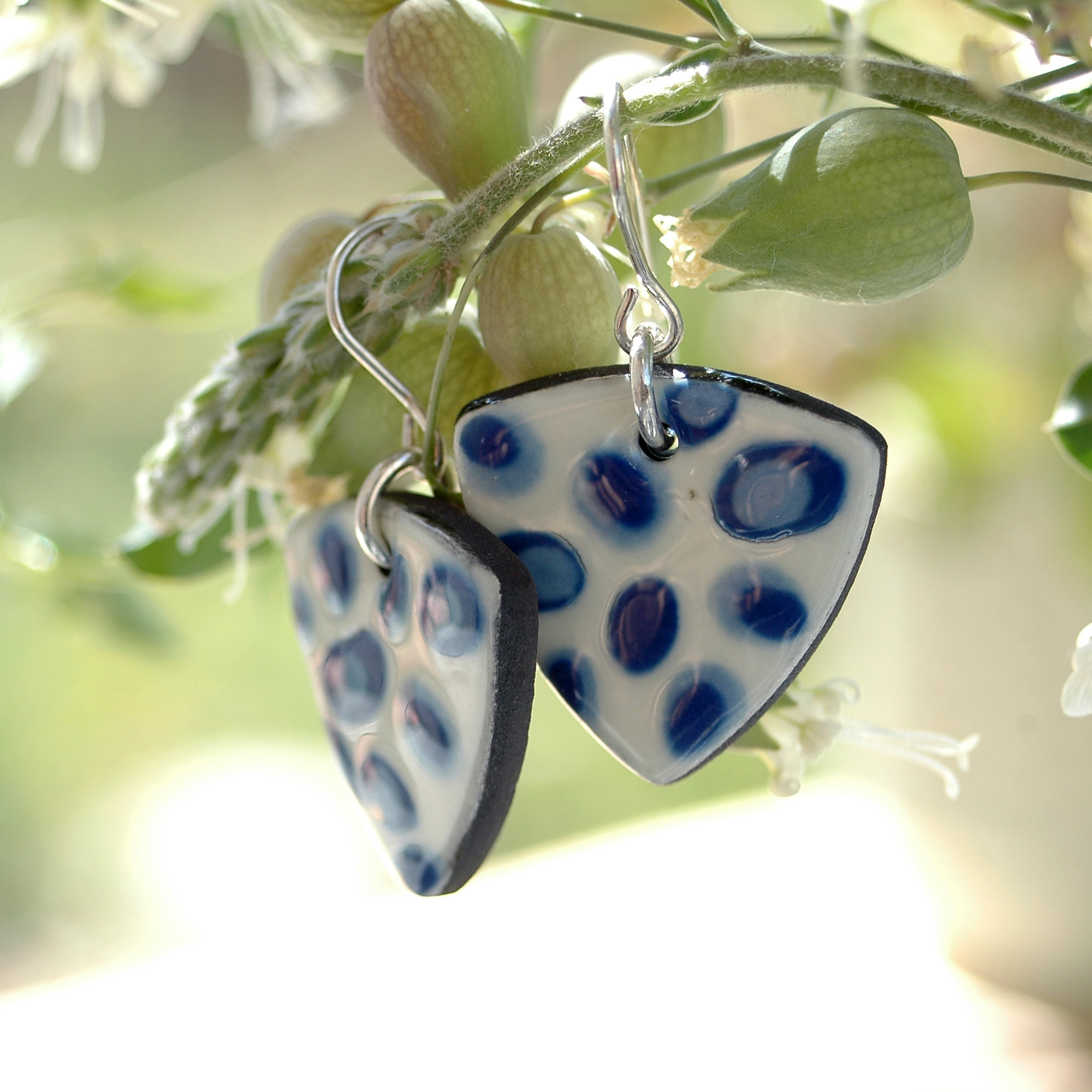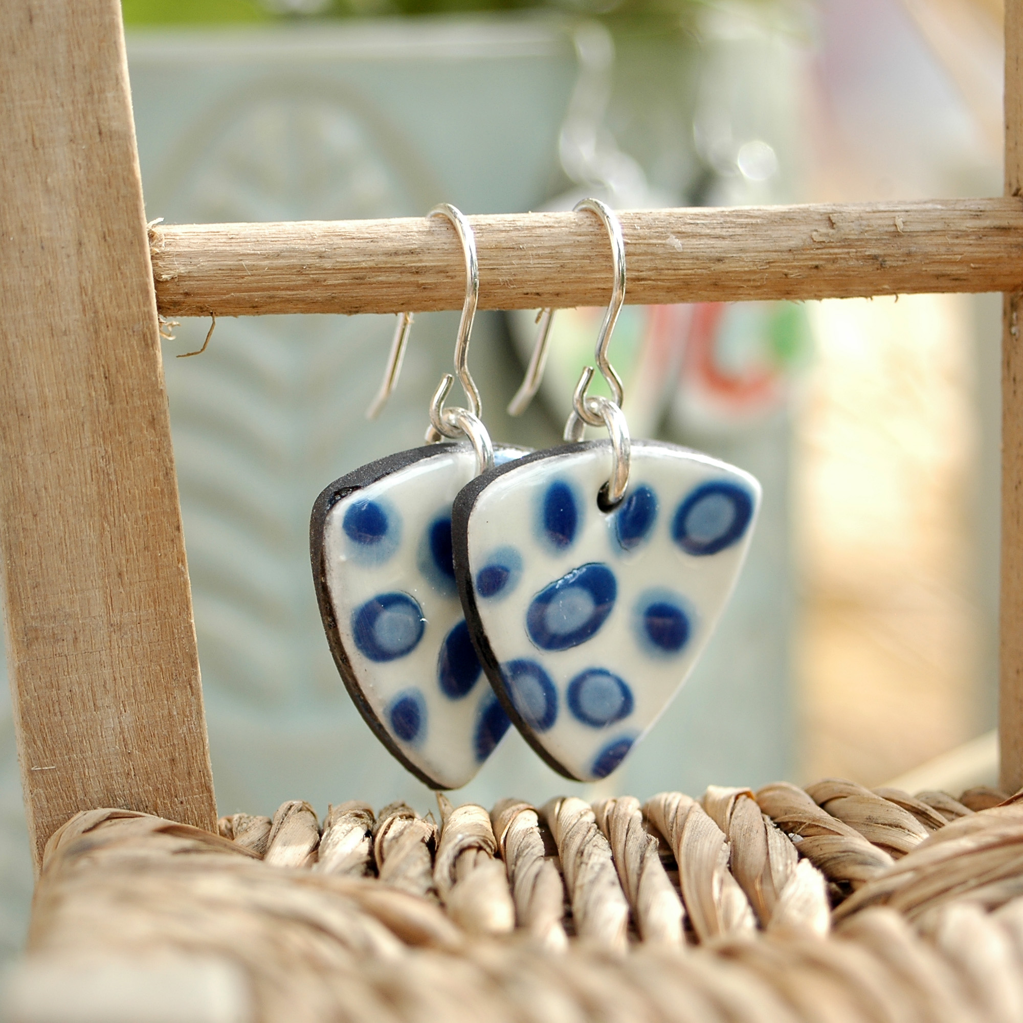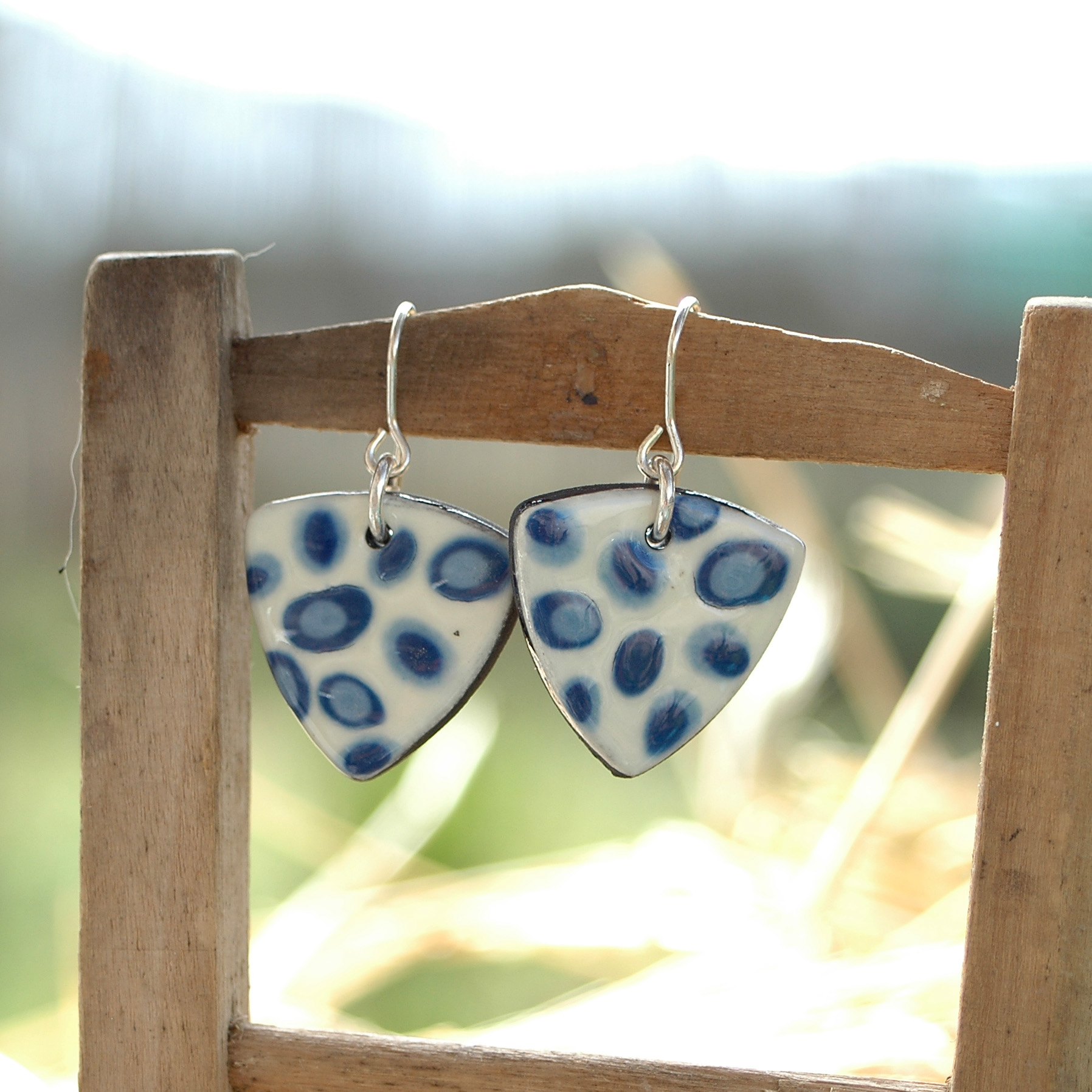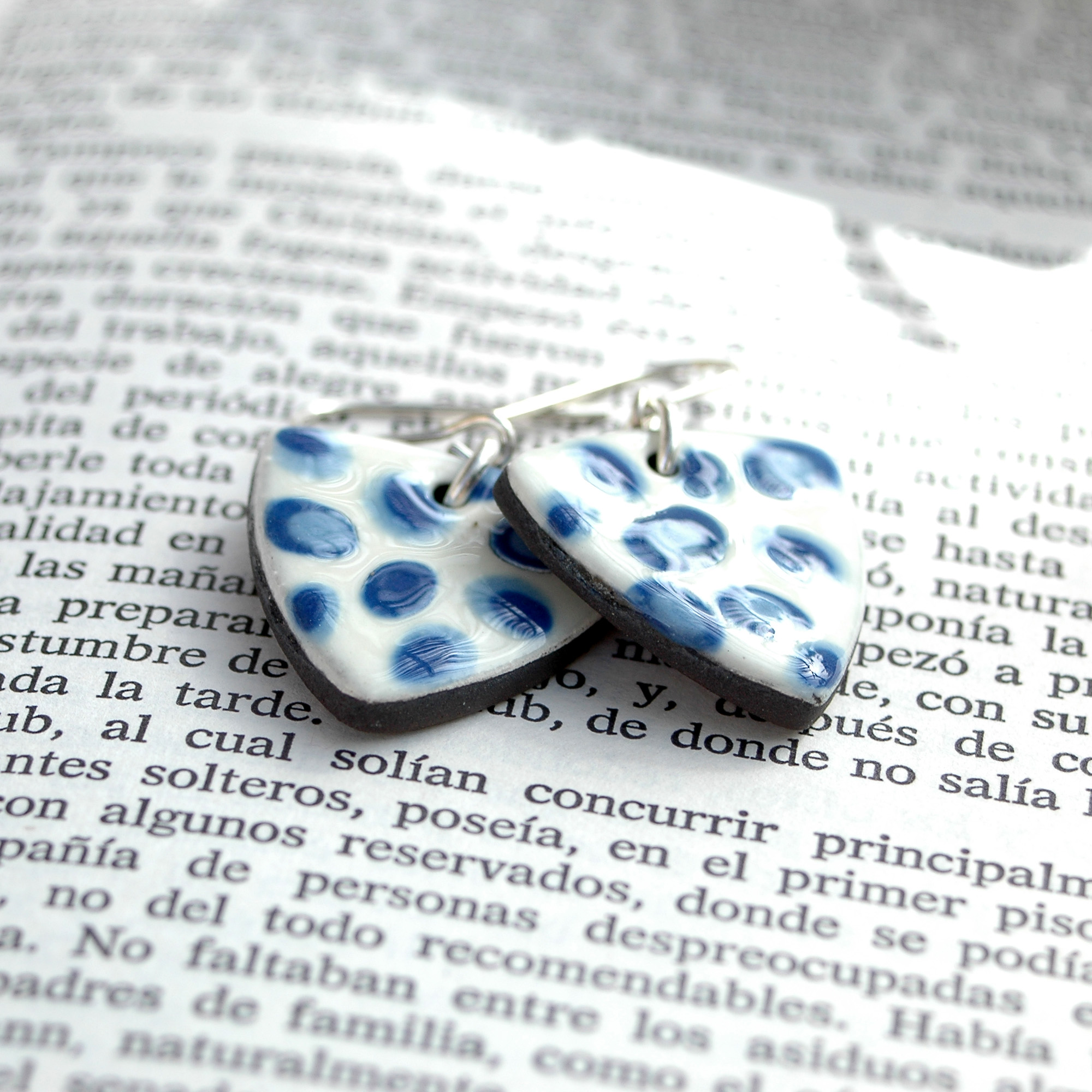 Pendientes de una pieza triangulares con fondo blanco y manchas azuladas.