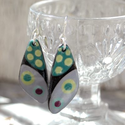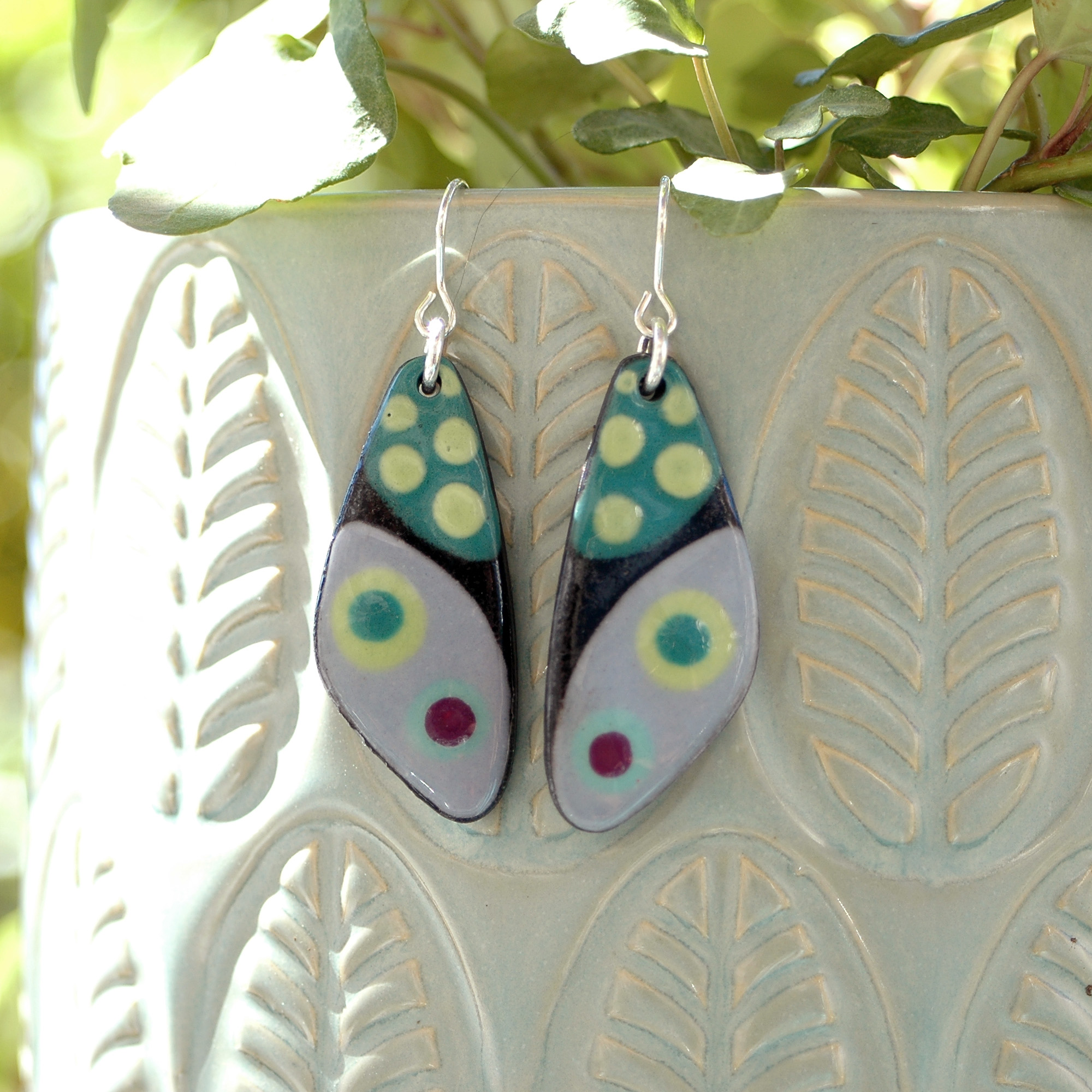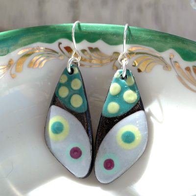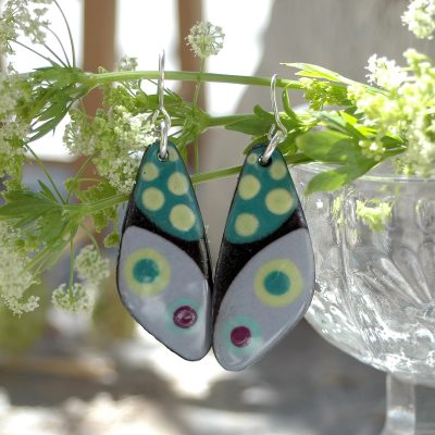 Pendiente de una pieza en forma de «ala de mariposa» en colores verdes y morados. Metales: Plata de Ley.