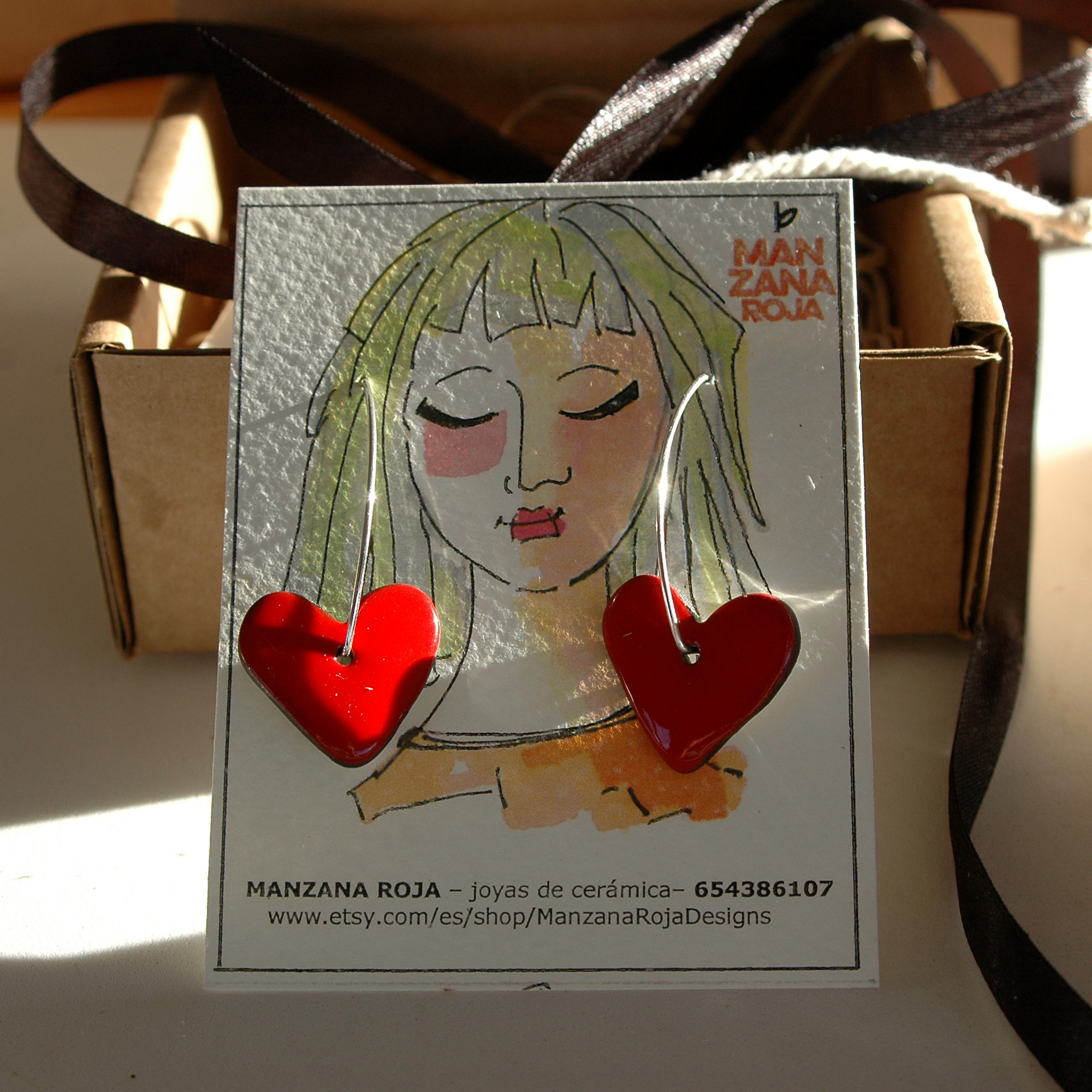 Pendientes Corazón Rojo de cerámica con gancho de plata largo.