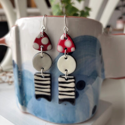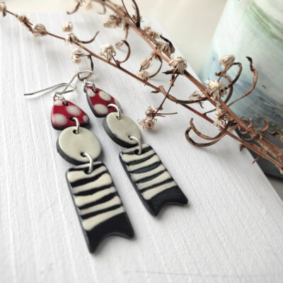 Pendiente largo de tres piezas en colores Blanco, Negro y Rojo.