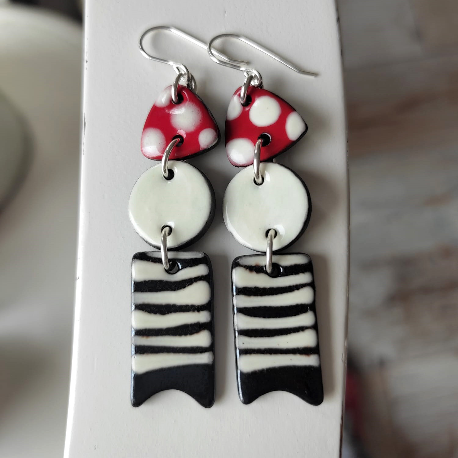 Pendiente largo de tres piezas en colores Blanco, Negro y Rojo.