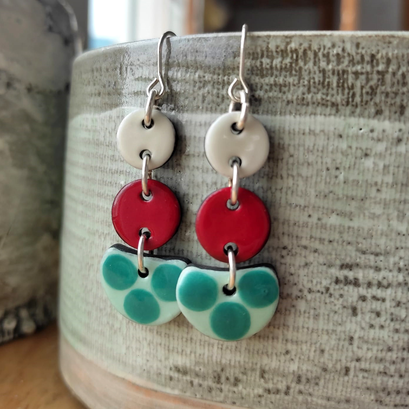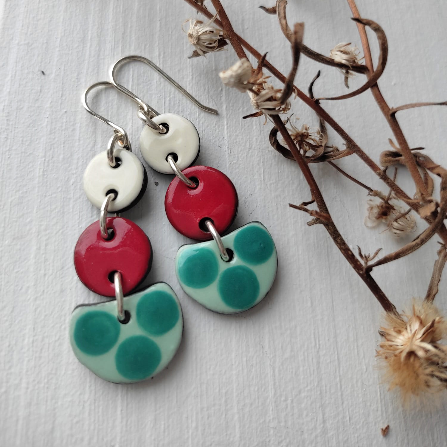 Pendientes largos de tres piezas en Rojo, Blanco y Verde Turquesa.
