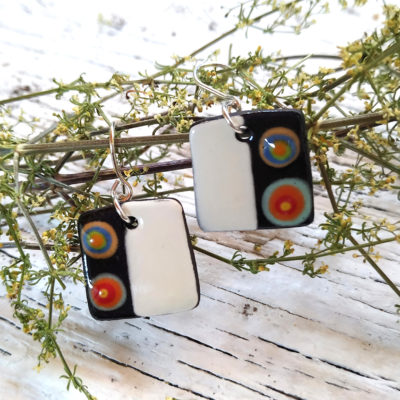 Esta joya está equilibrada en el color y la forma, pues una mitad está decorada con motivos psicodélicos redondos (que contrastan con la forma cuadrada del pendiente) y la otra mitad está decorada en color blanco liso -minimalista- que apacigua y equilibra toda la información. De este modo, estos creativos pendientes combinan inteligencia, delicadeza y generosidad. Fáciles de combinar, ligeros y livianos… no te cansarás de utilizar todos los días. Una excelente pieza de cerámica en tu rostro, magnética y llena de magia.