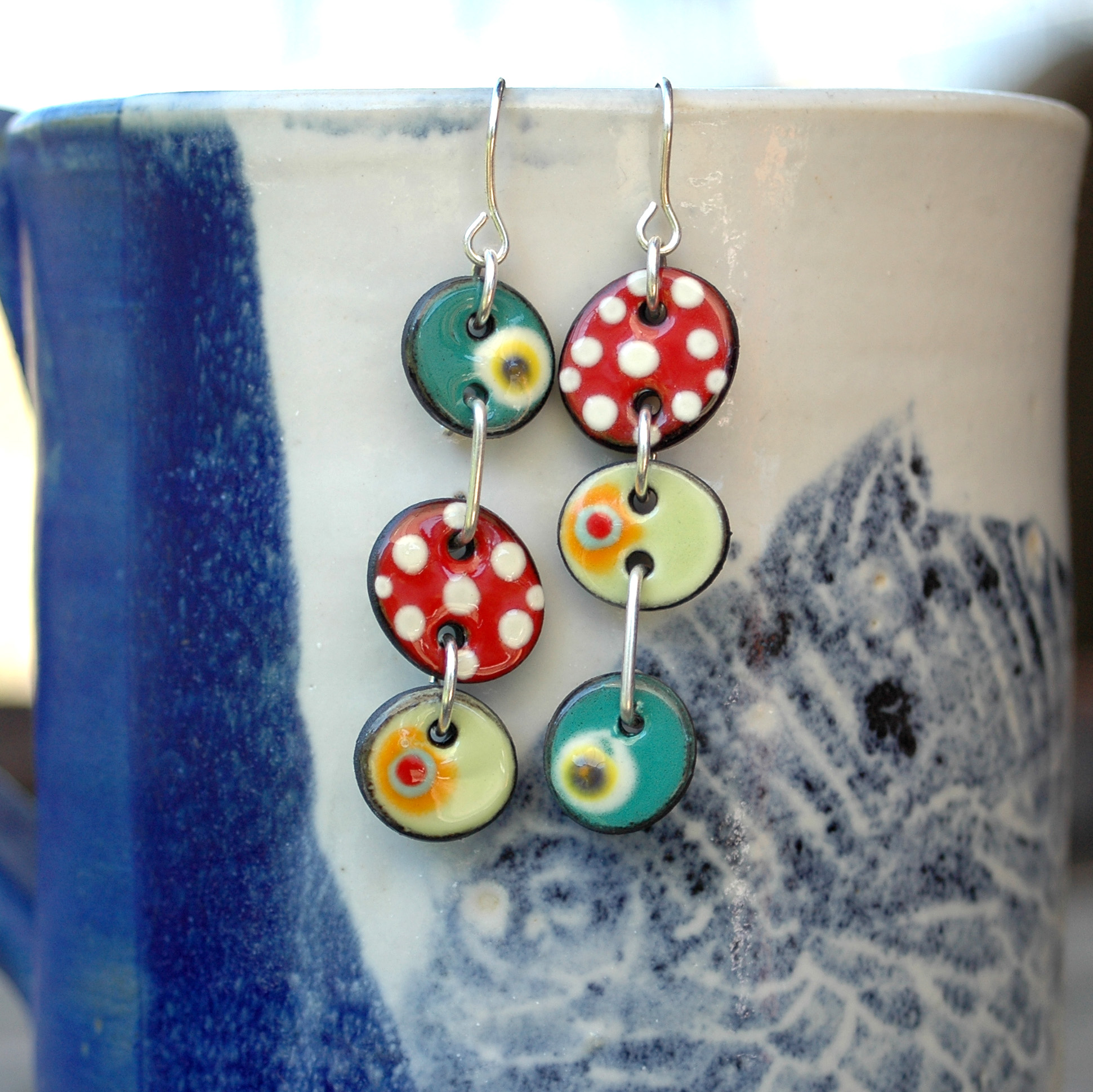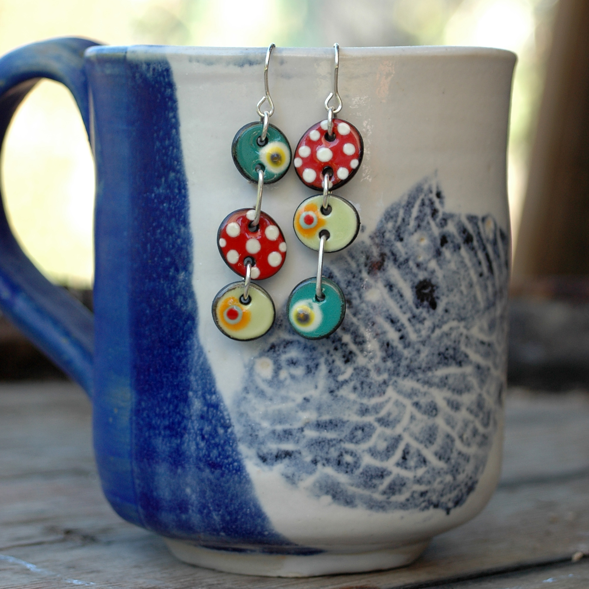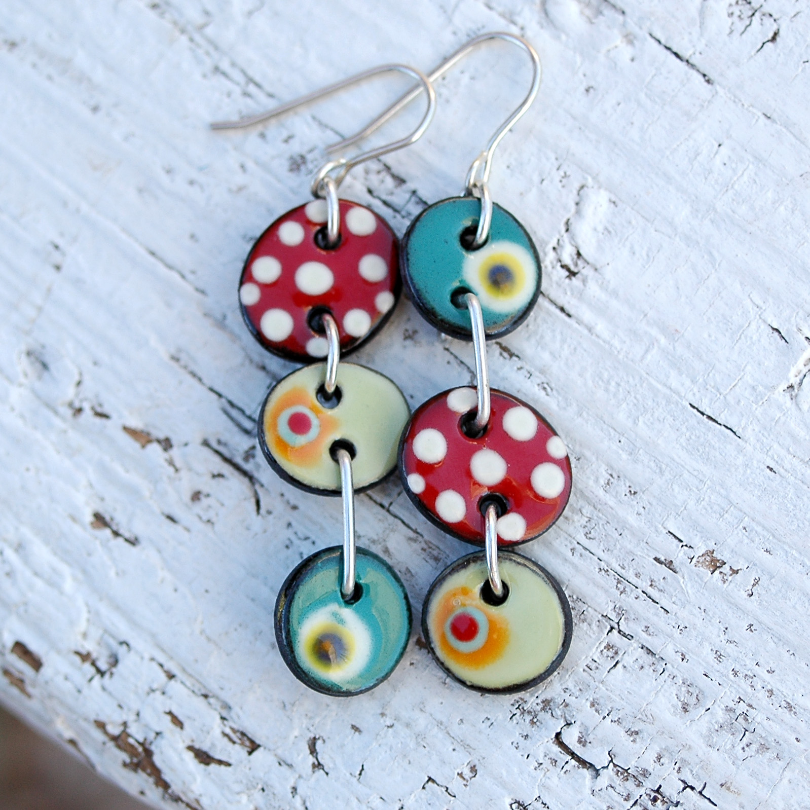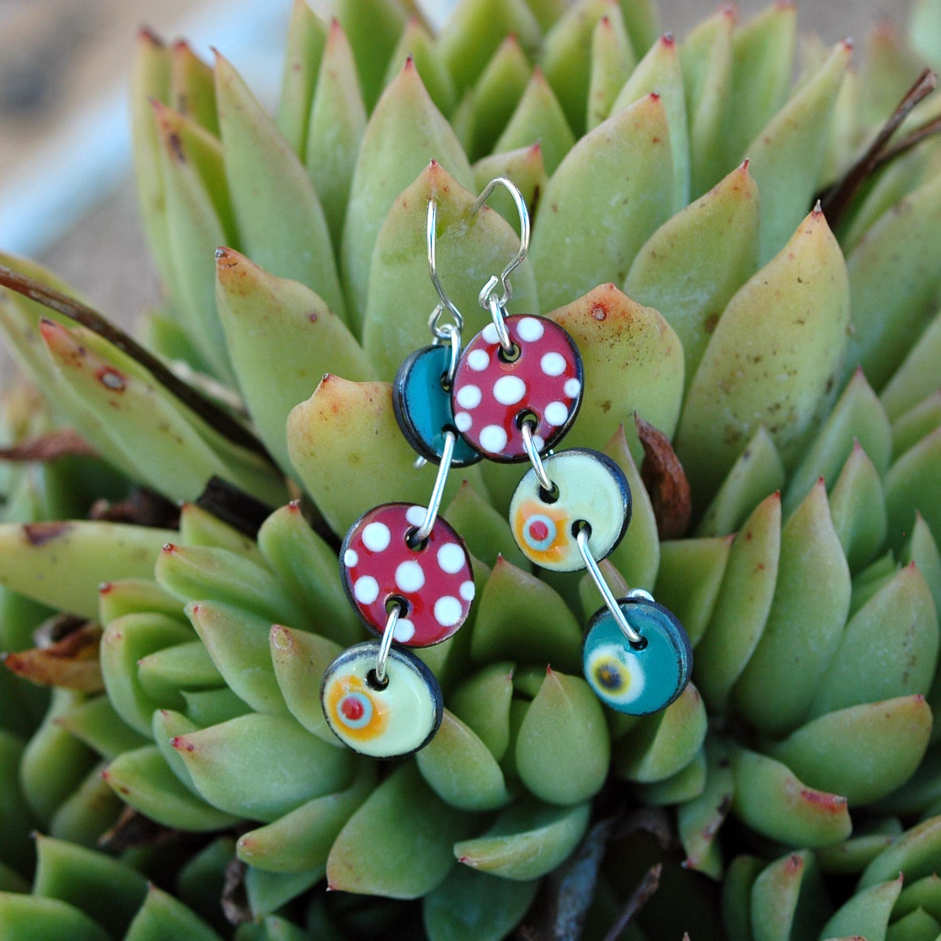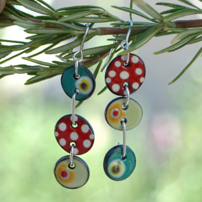 Estos pendientes son muy originales por su forma, color y estilo. Son de tres piezas, unidas con un hilo de plata que le dan un movimiento muy atrevido. Largos y livianos, no pasarán desapercibidos y te sentirás llena de estilo. Sus colores son muy llamativos, verde «nilo», lima claro y rojo con topitos blancos, alternándolos arriba y abajo y decorados con círculos psicodélicos. Son ligeros a pesar de su tamaño y los metales son de plata hipoalergénica para que no te hagan daño. El cierre es de gancho de plata, cómodo y fácil de poner y quitar. Te recomiendo utilizar los topes de silicona que encontrarás en el paquete. Te gustan?, son irresistibles!