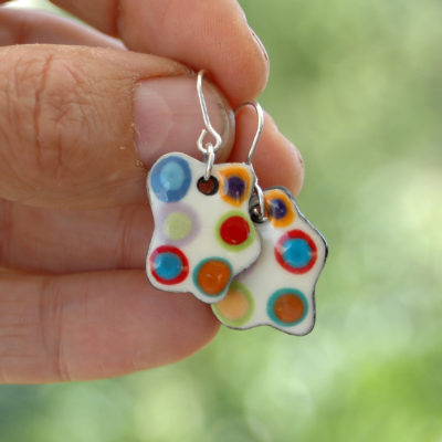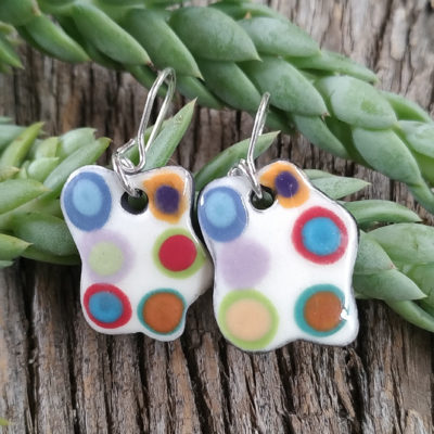 Estos pendientes son una elección fresca y mediterránea llena de energía. Su forma irregular es muy original. En el fondo blanco resaltan todos los colores para que luzcas muy bonita. Son ideales para combinar a todas horas pues no te cansarás de usarlos. Es un pendiente básico y ligero, disfrutarás de su luz y luminosidad. Una buena elección que dará color en tu cara, pues al ser claritos realzarán en la zona oscura de tu cara y cabello. Juveniles, diferentes, llenos de amor…, una joya casual y divertida llena de creatividad, como la paleta de un pintor. Pinta tu rostro de lunares de colores que no pasarán inadvertidos.