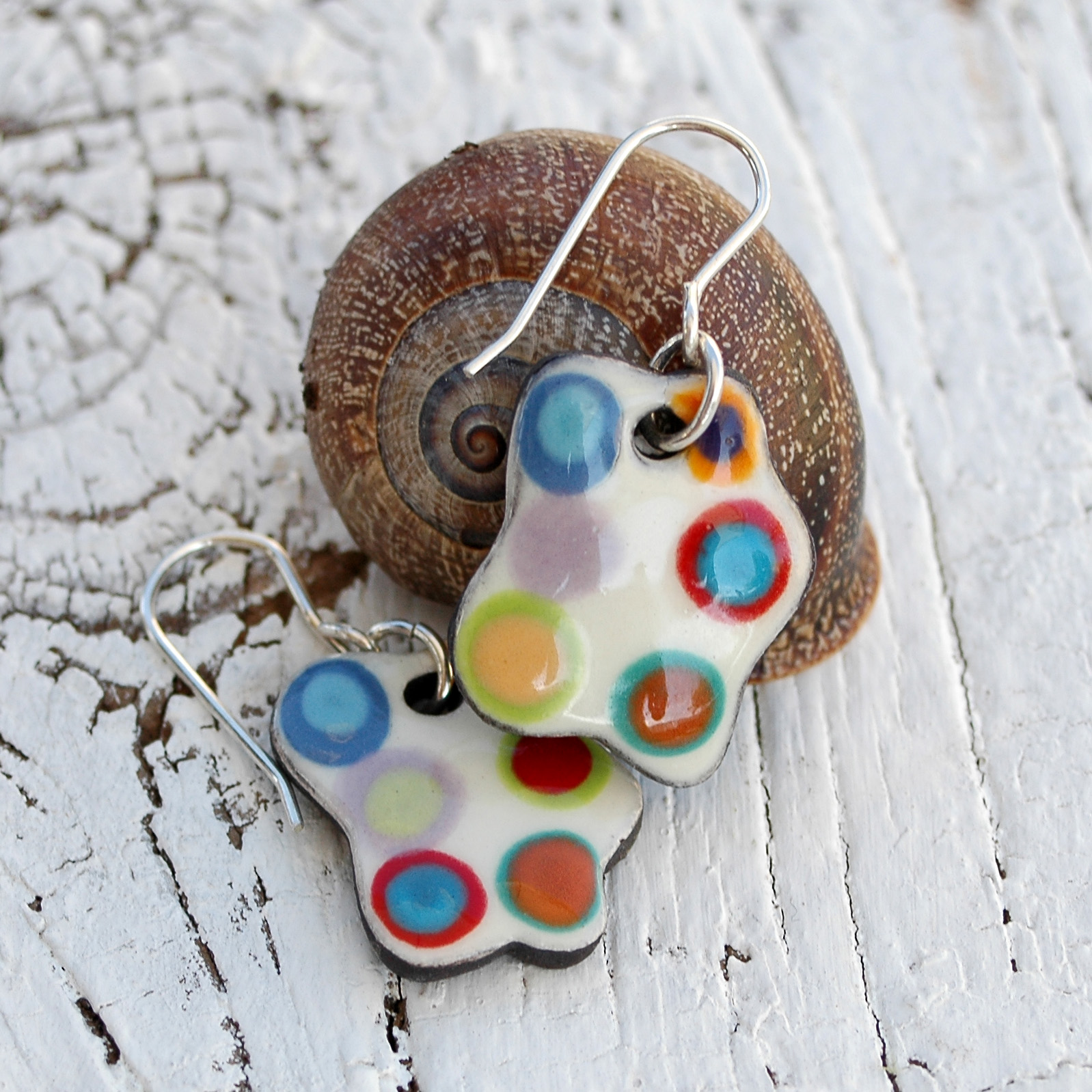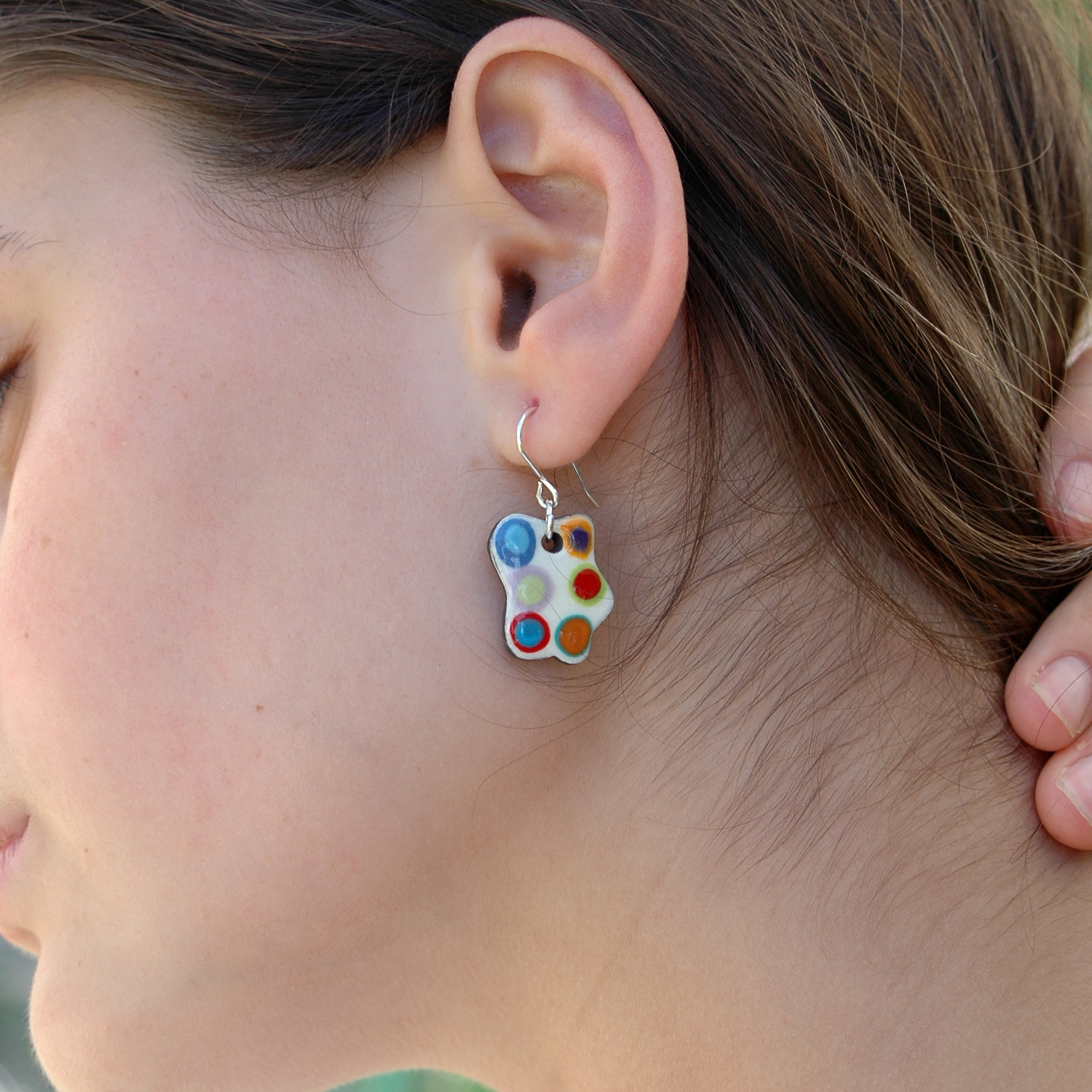 Estos pendientes son una elección fresca y mediterránea llena de energía. Su forma irregular es muy original. En el fondo blanco resaltan todos los colores para que luzcas muy bonita. Son ideales para combinar a todas horas pues no te cansarás de usarlos. Es un pendiente básico y ligero, disfrutarás de su luz y luminosidad. Una buena elección que dará color en tu cara, pues al ser claritos realzarán en la zona oscura de tu cara y cabello. Juveniles, diferentes, llenos de amor…, una joya casual y divertida llena de creatividad, como la paleta de un pintor. Pinta tu rostro de lunares de colores que no pasarán inadvertidos.