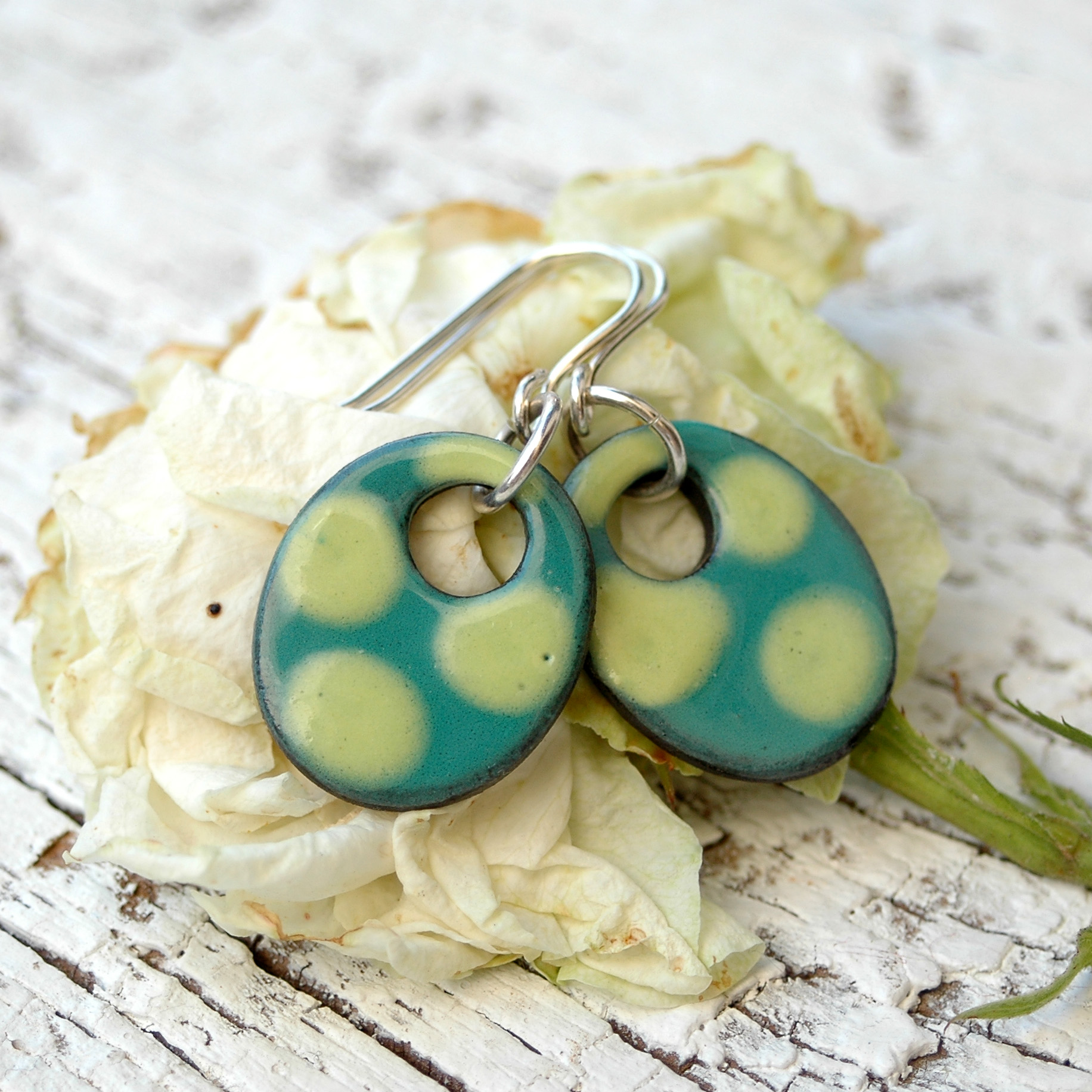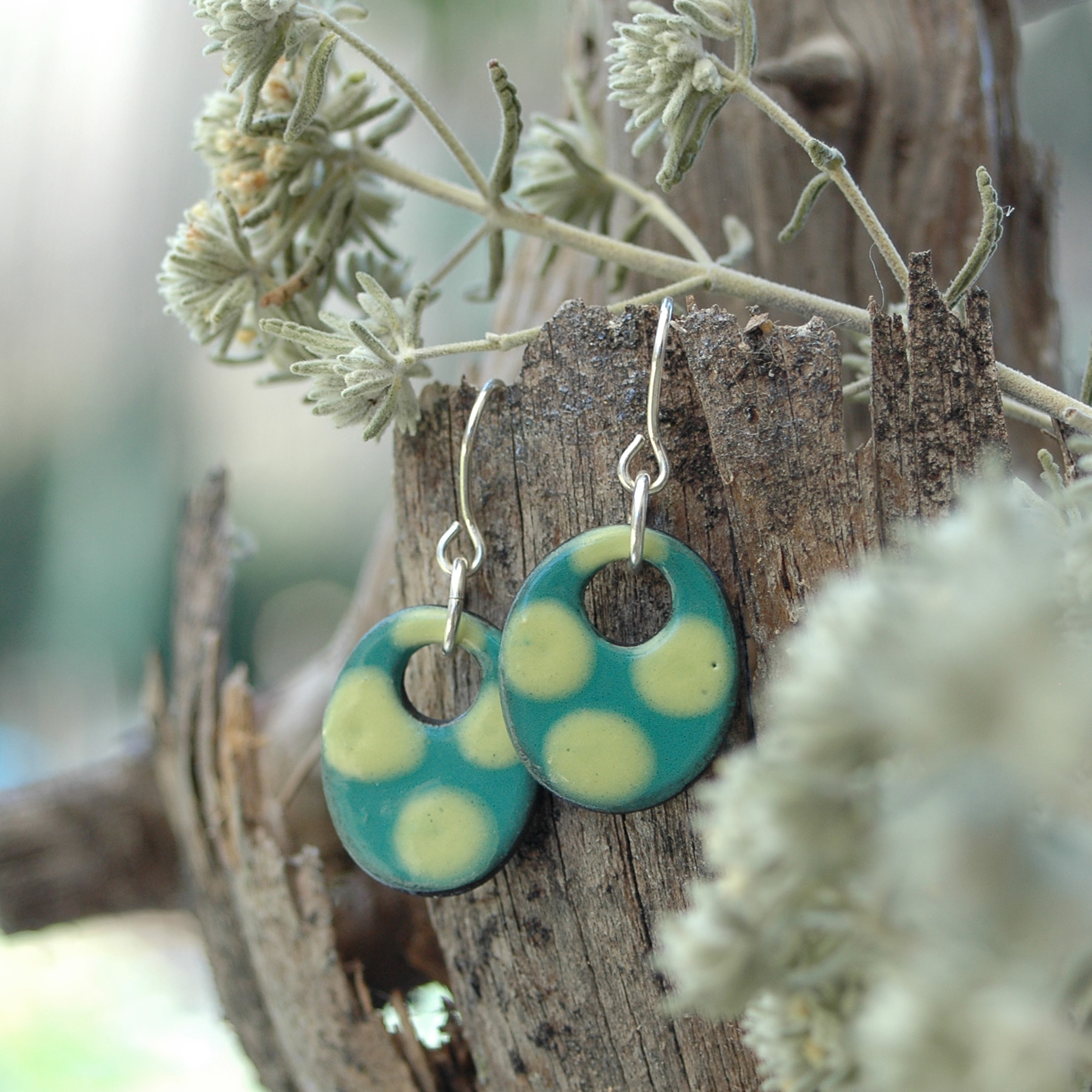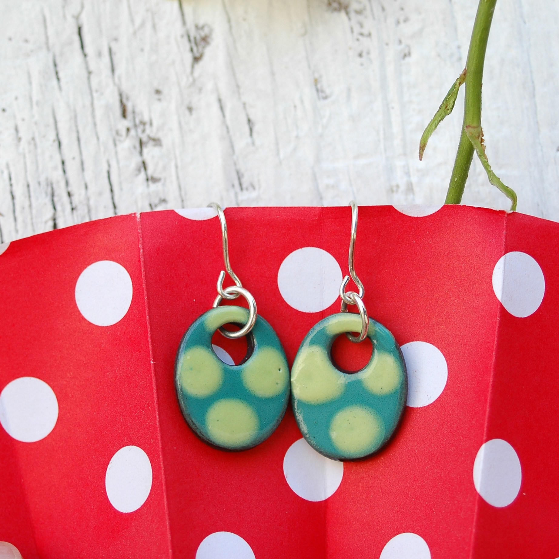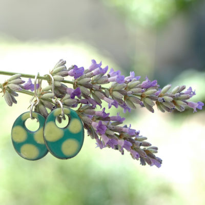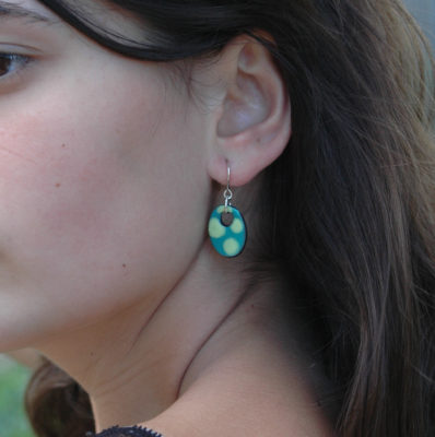Estos pendientes son muy originales por su forma y sus colores. El color verde en el fondo realza los puntitos más claros contrastándolos delicadamente. Son cómodos de llevar y muy ligeros. Los lunares, son un estilo propio del arte flamenco del sur de España. Te alegrarán el rostro y son un complemento ideal para usarlo todos los días, pues favorecen los rasgos de tu cara. Te sentirás libre, divertida y muy luminosa. Una sutil joya conectada con la madre tierra, con la primavera y con la alegría.