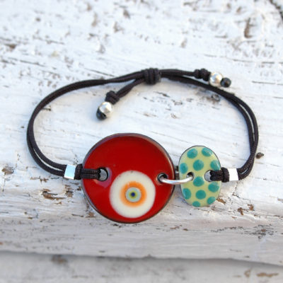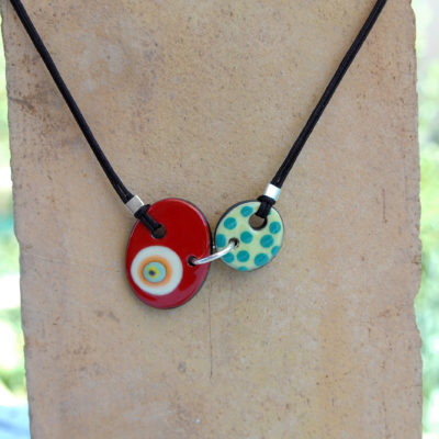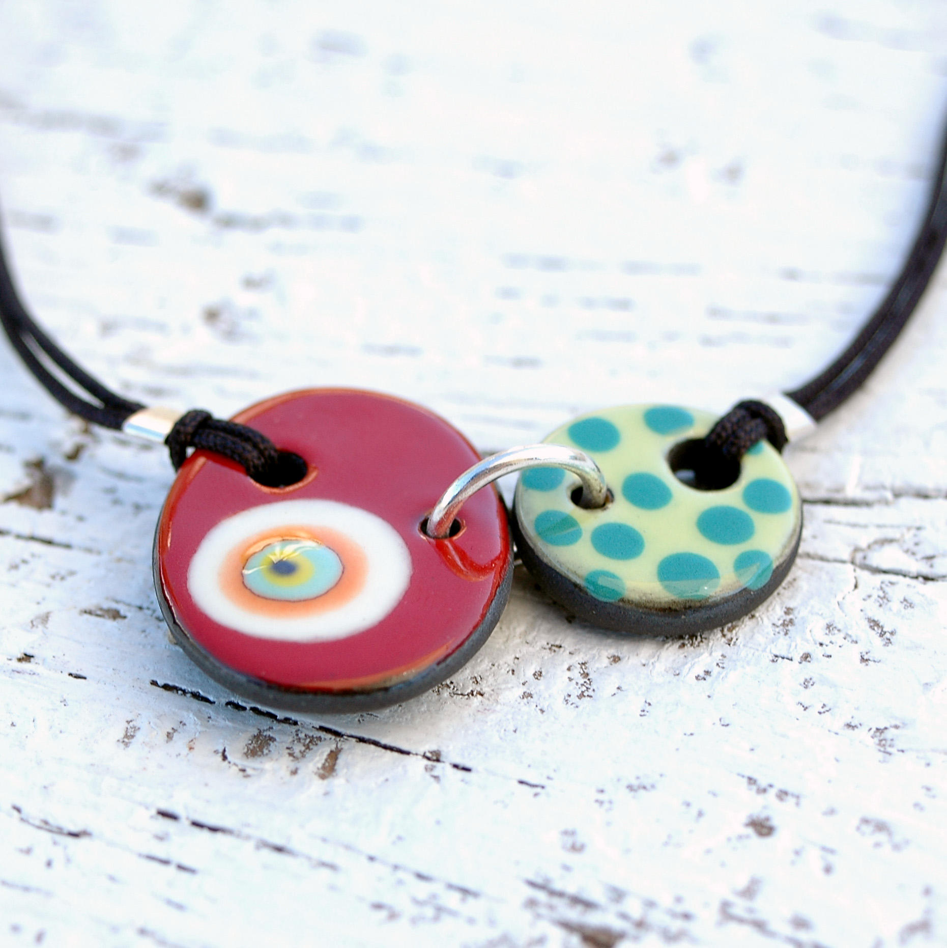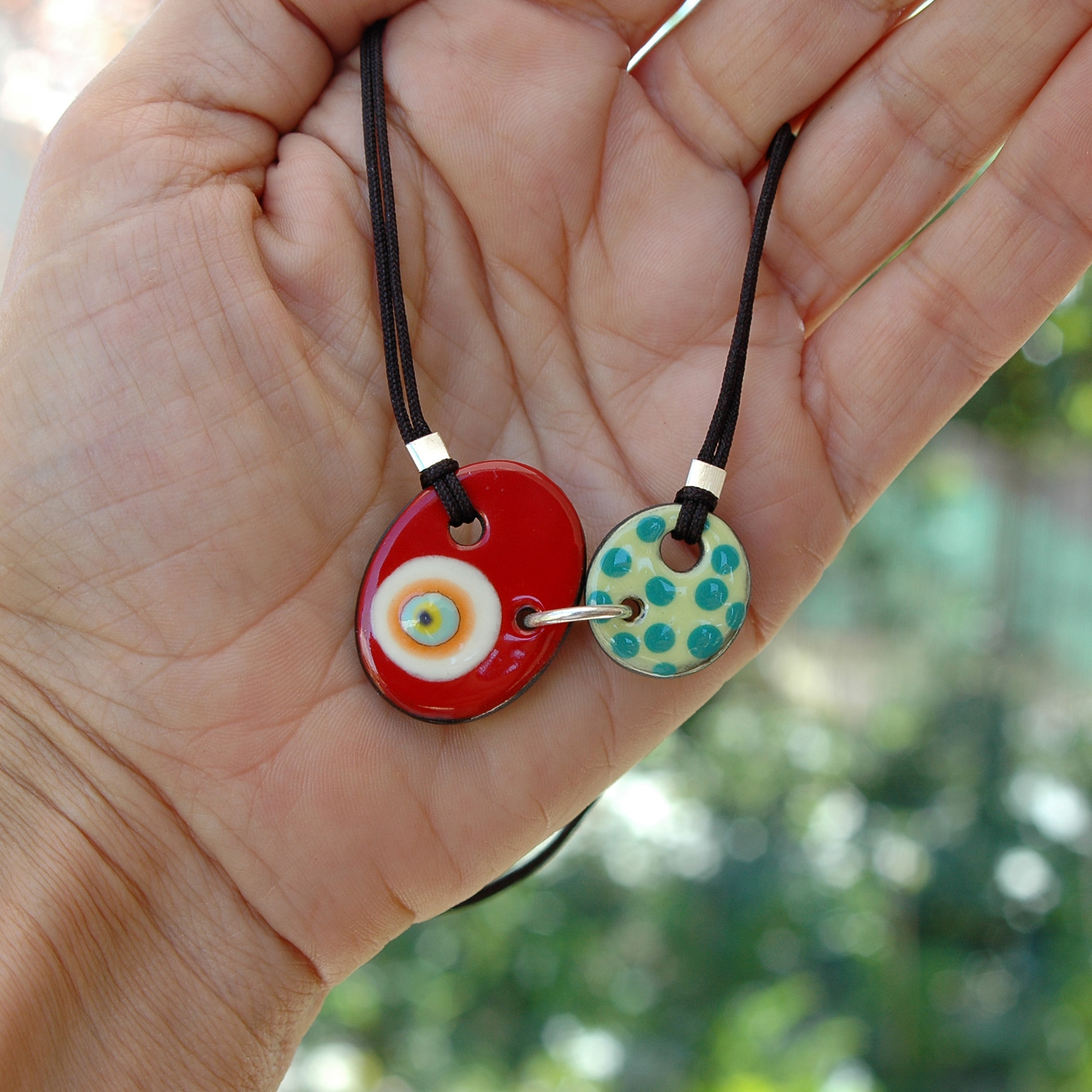 Esta bonita gargantilla ajustable lucirá original en tu escote. Me gusta combinar el color rojo y verde creando un estilo fresco e innovador. Ligera y cómoda, podrás llevarla a diario pues su tamaño es ideal. Esta joya está compuesta por dos piezas de cerámica , una más grande y roja de estilo psicodélico junto con una verde de lunares muy mediterráneos, ambas están unidas por una anilla de plata de Ley. El cordón es de nylon duradero y su cierre es ajustable mediante una bola de plata que se desliza fácilmente. Cada extremo del cordón tiene una pequeña bolita de plata hipoalergénica. Creativa, pintada a mano y muy exclusiva.