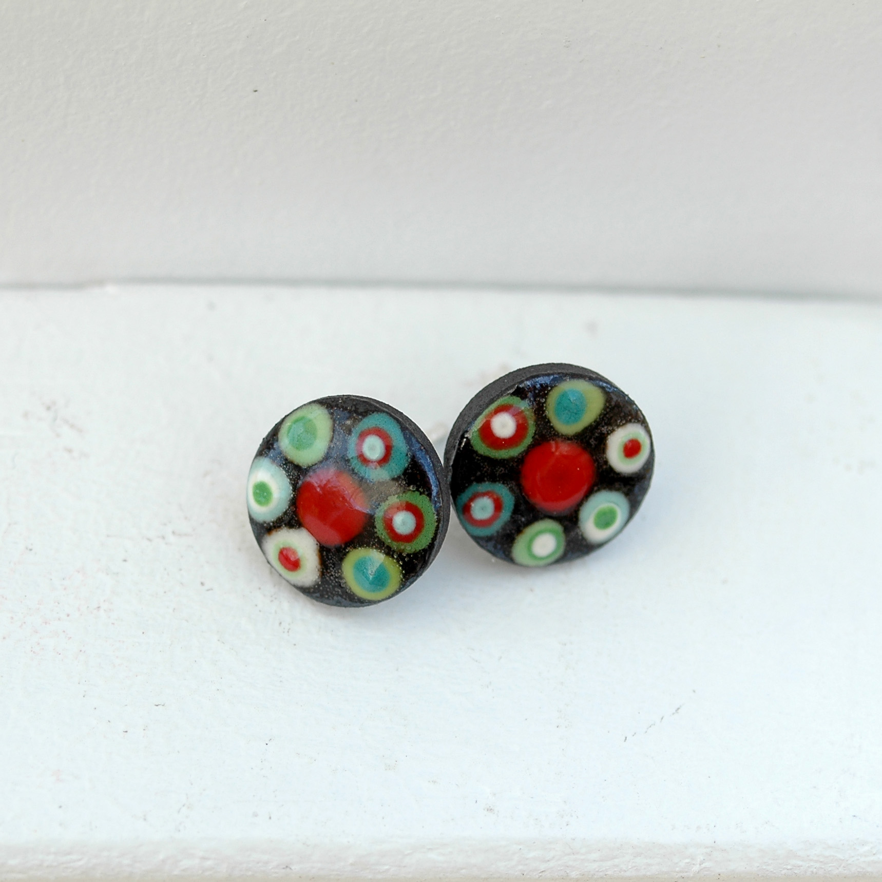 Originales pendientes pequeños con cierre de presión en plata de 1ª Ley. Son muy elegantes, en el fondo negro resaltan con alegría los colores verde y rojo. Cuando los lleves puestos se iluminará tu cara y te llenarán de energía. Son joyas únicas y llenas de amor. No te cansarás de llevarlos todos los días. Los metales (palito y tuerca) son de plata hipoalergénica, así evitarás que te hagan daño y los podrás disfrutar con tranquilidad.
