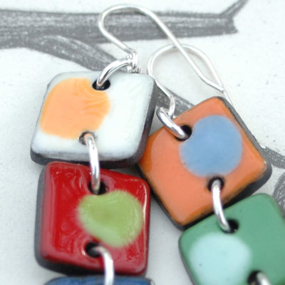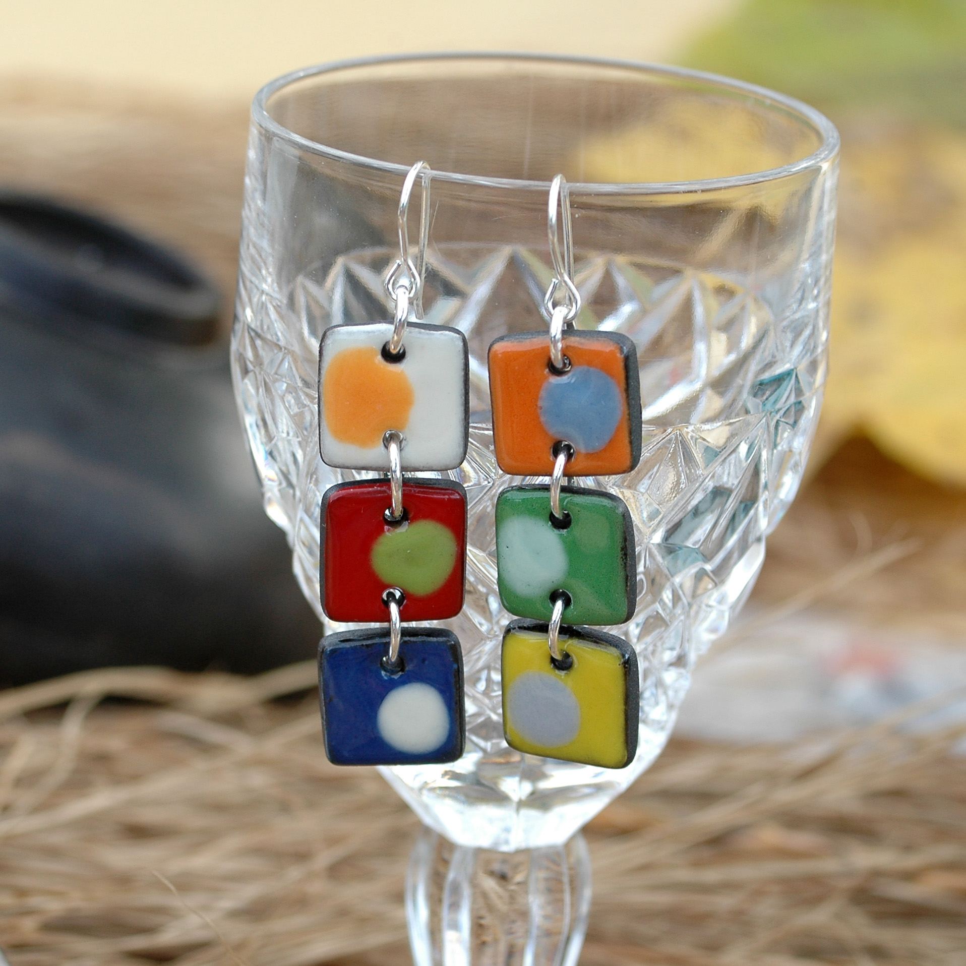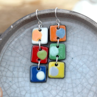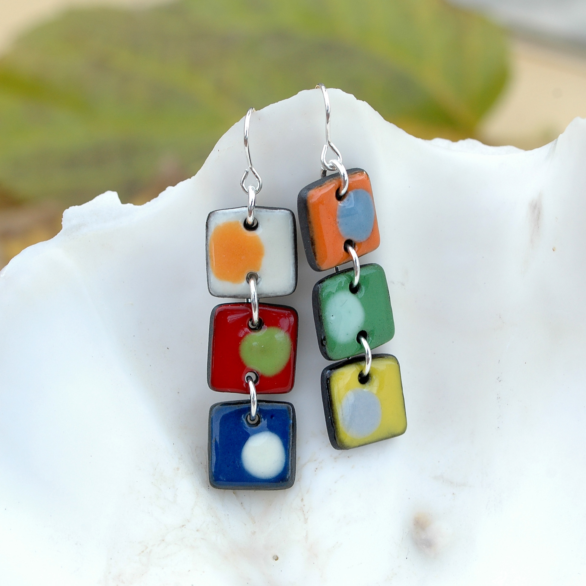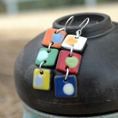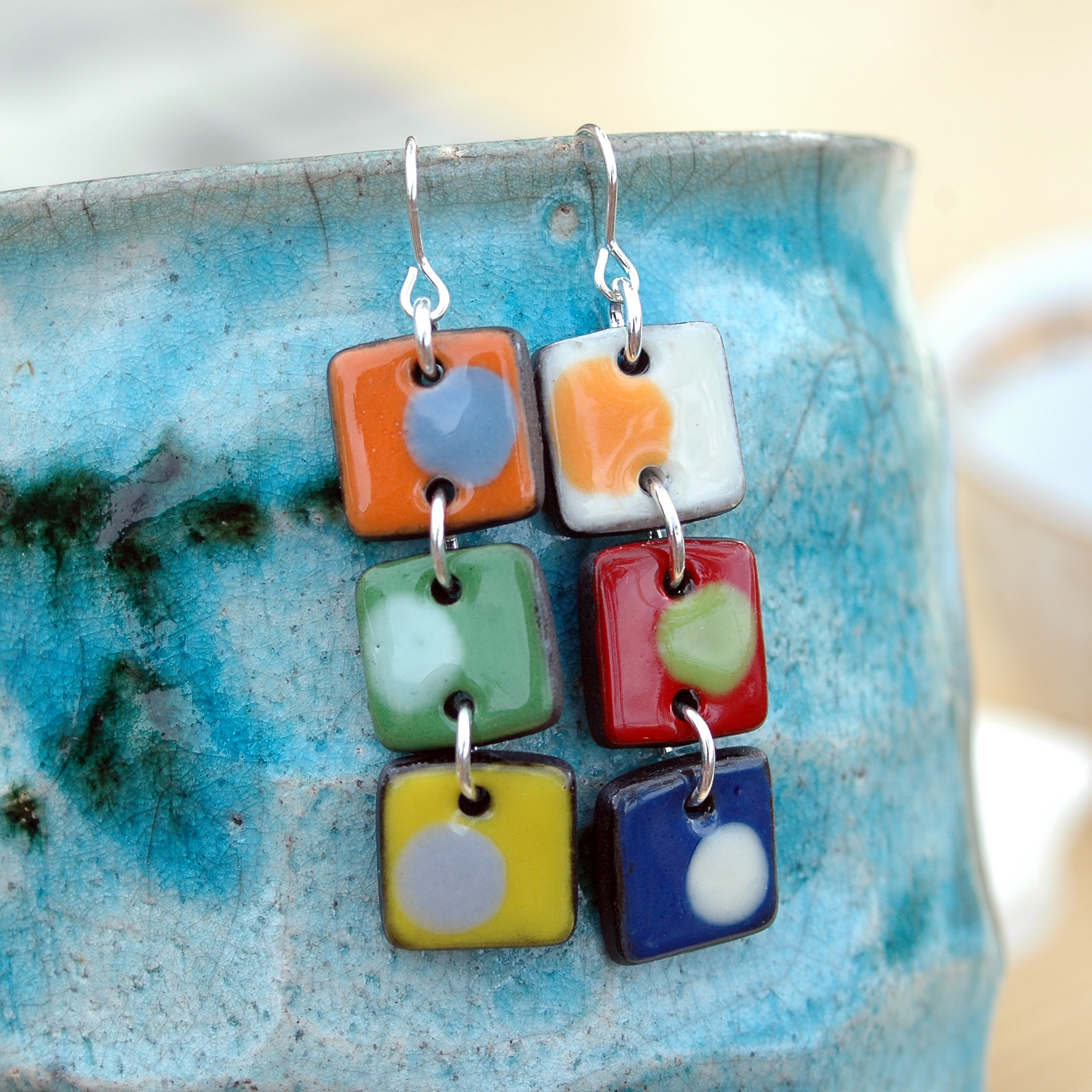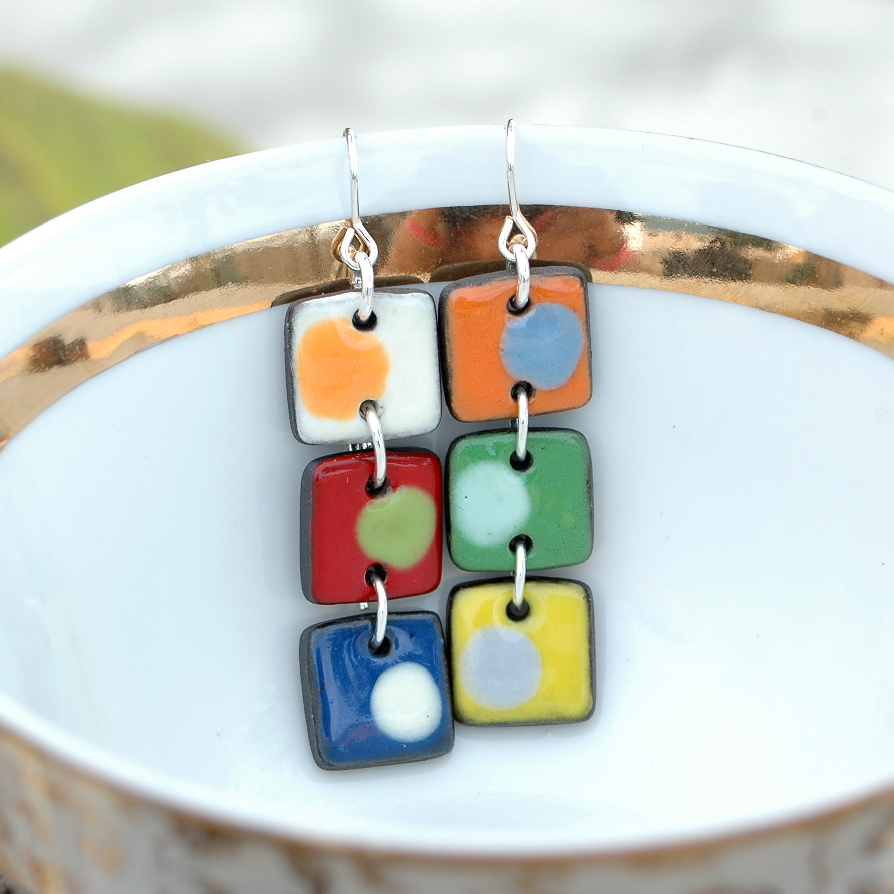 Pendientes geométricos largos de tres piezas en cerámica y plata.