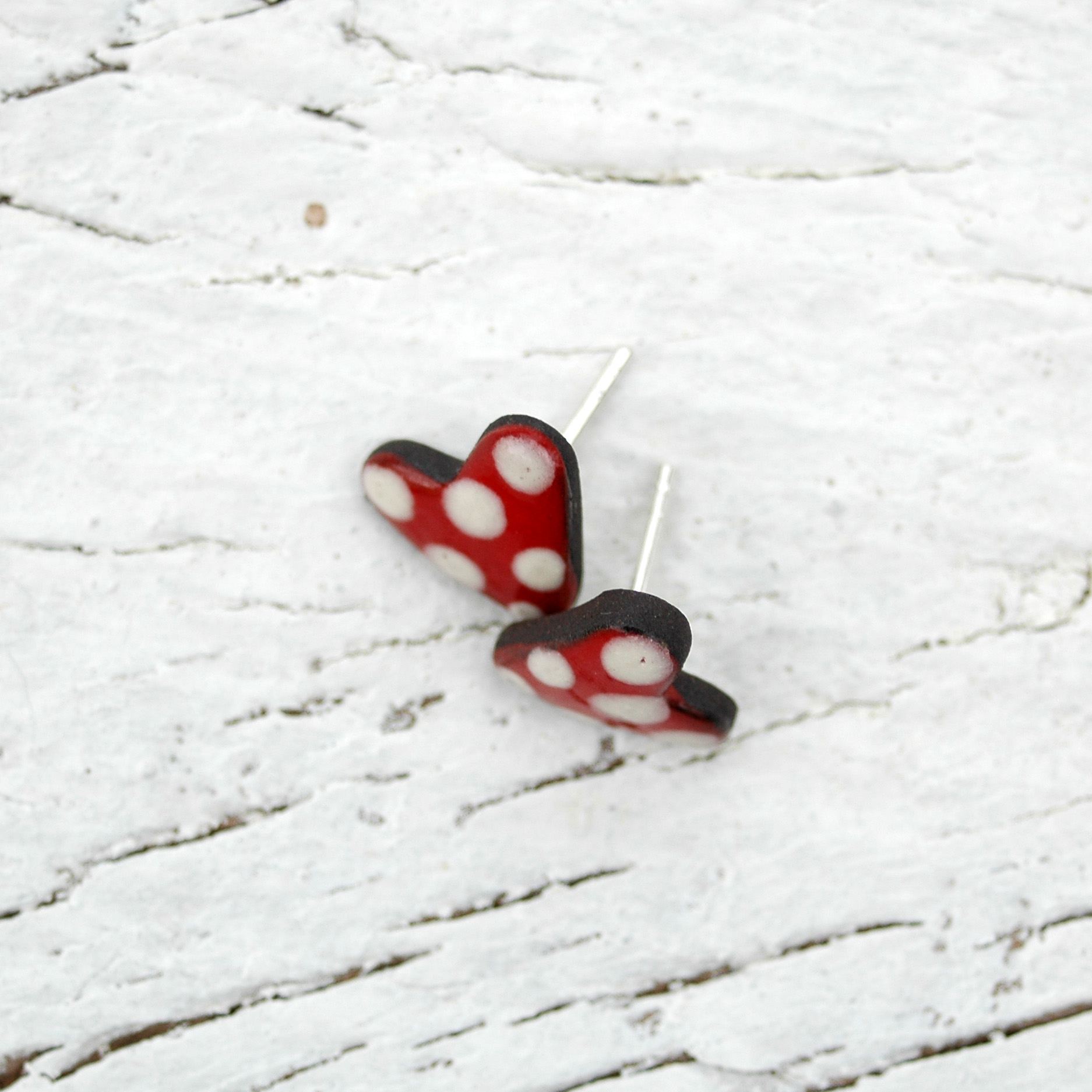 Alegres pendientes de corazón rojo y lunares blancos. Sistema de cierre de presión en plata de primera Ley, cómodos y de uso diario.