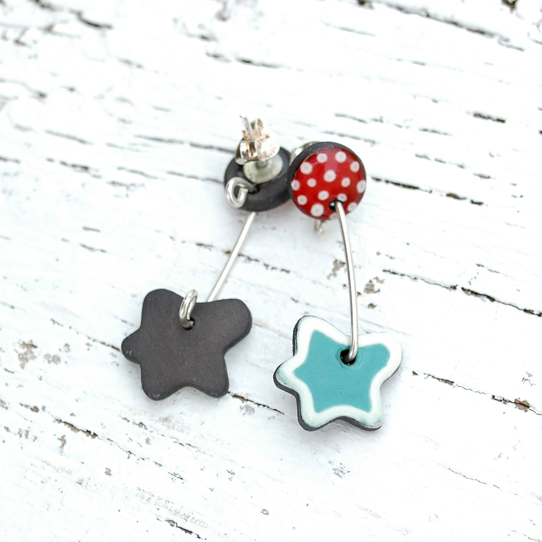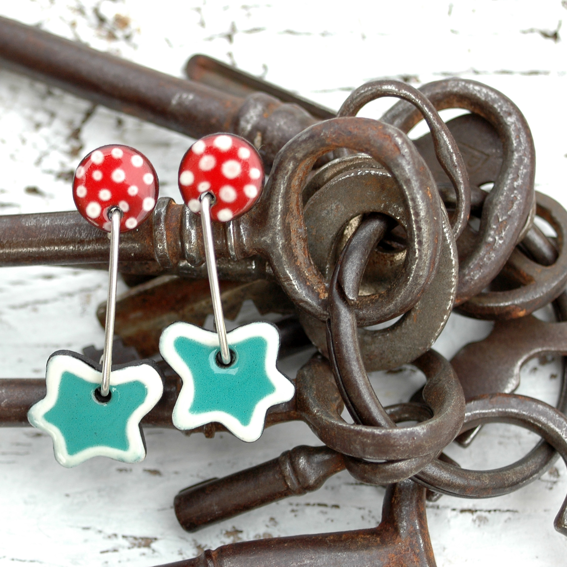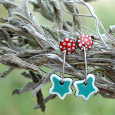 Pendientes románticos y delicados. Su diseño es precioso, combina con acierto los colores rojo (con topitos blancos) y verde (en forma de hoja). Las dos piezas están unidas por un hilo rígido de plata de 1mm. de grosor, dándole un movimiento muy bonito y una longitud ideal. Están realizados en cerámica y el sistema de cierre es de presión. Todos los metales son en plata de 1ª Ley, por lo que no te darán alergia (incluyo las dos tuercas de cierre también en plata).