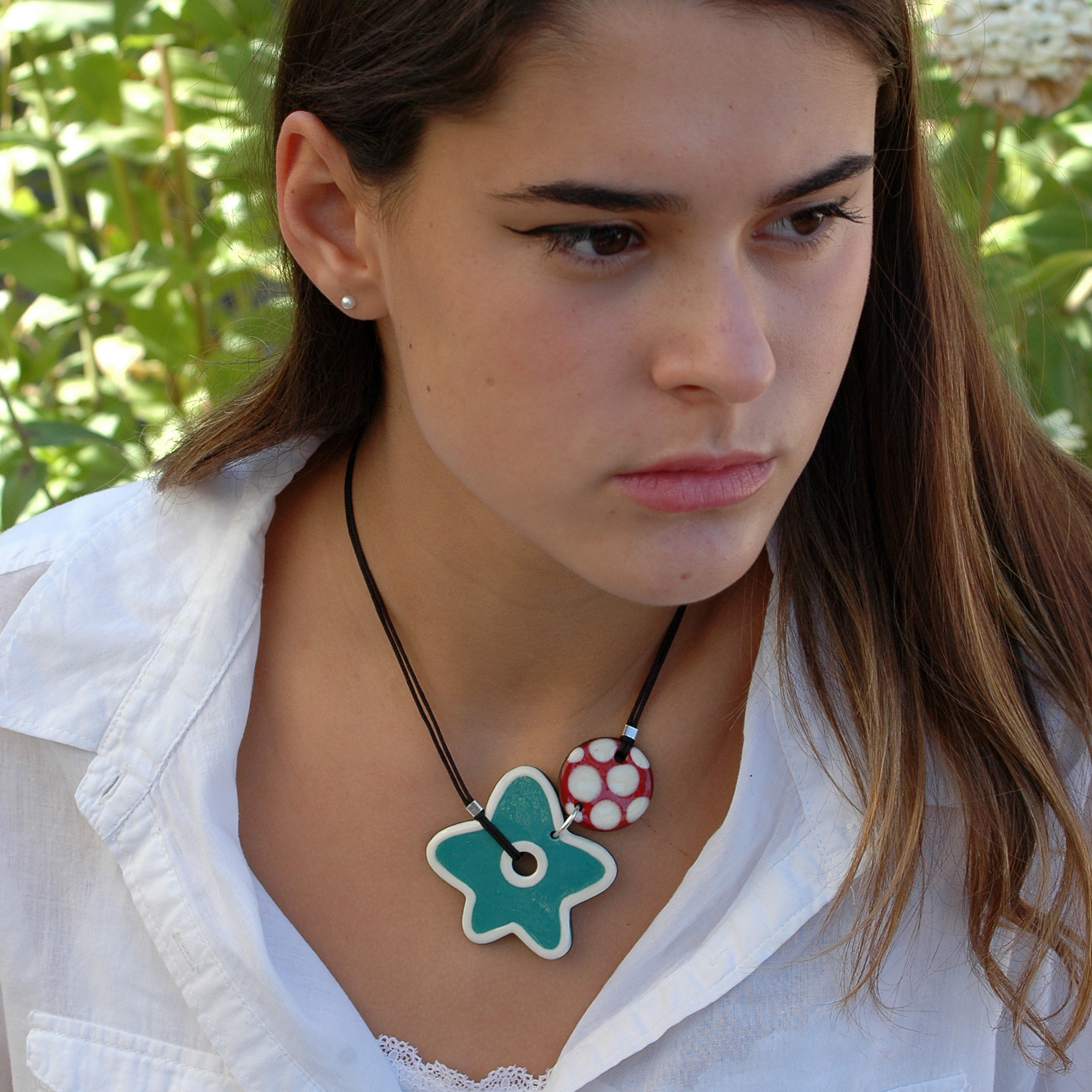 Cerámica y metales en plata de 1ª Ley. Utilizo arcilla negra y vidriados cerámicos, cada pieza la realizo a mano y la pinto una a una, por lo que cada una de ellas tienen pequeñas diferencias y particularidades siendo piezas únicas.