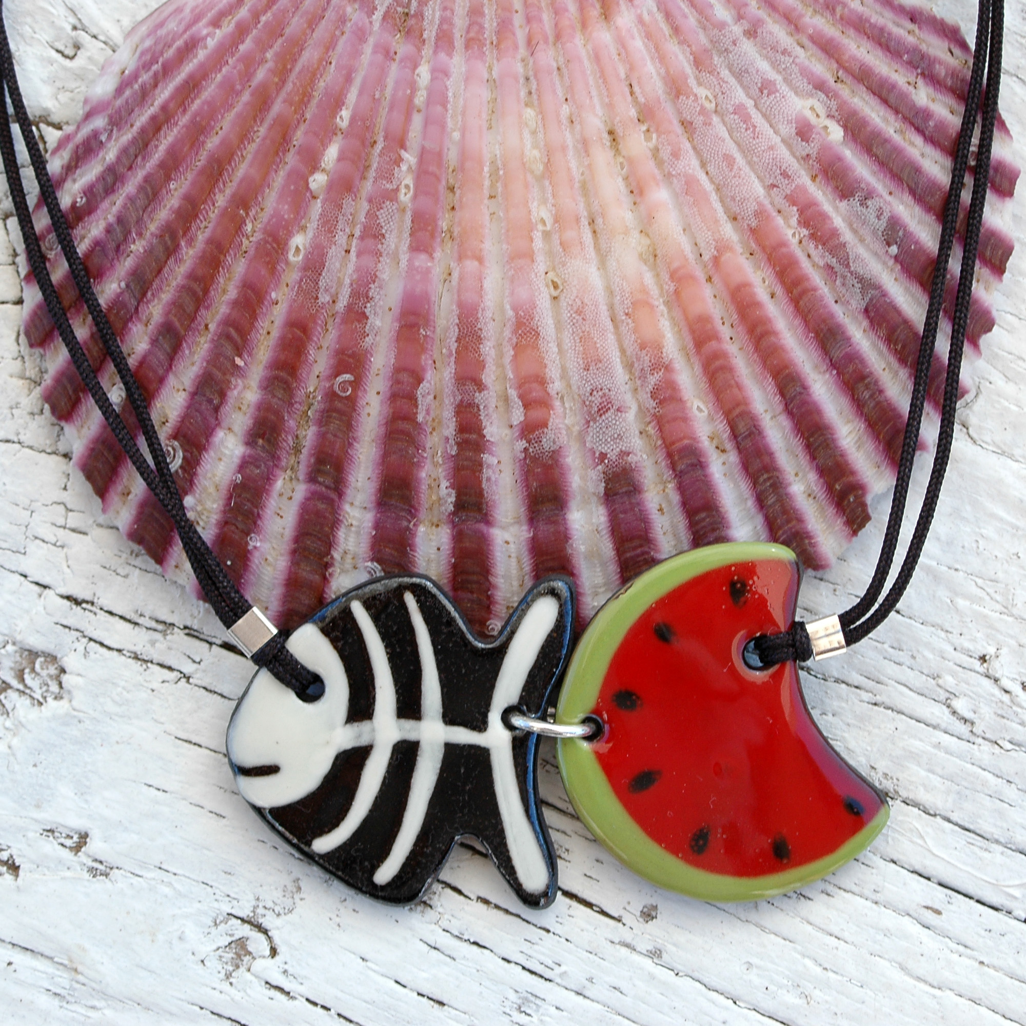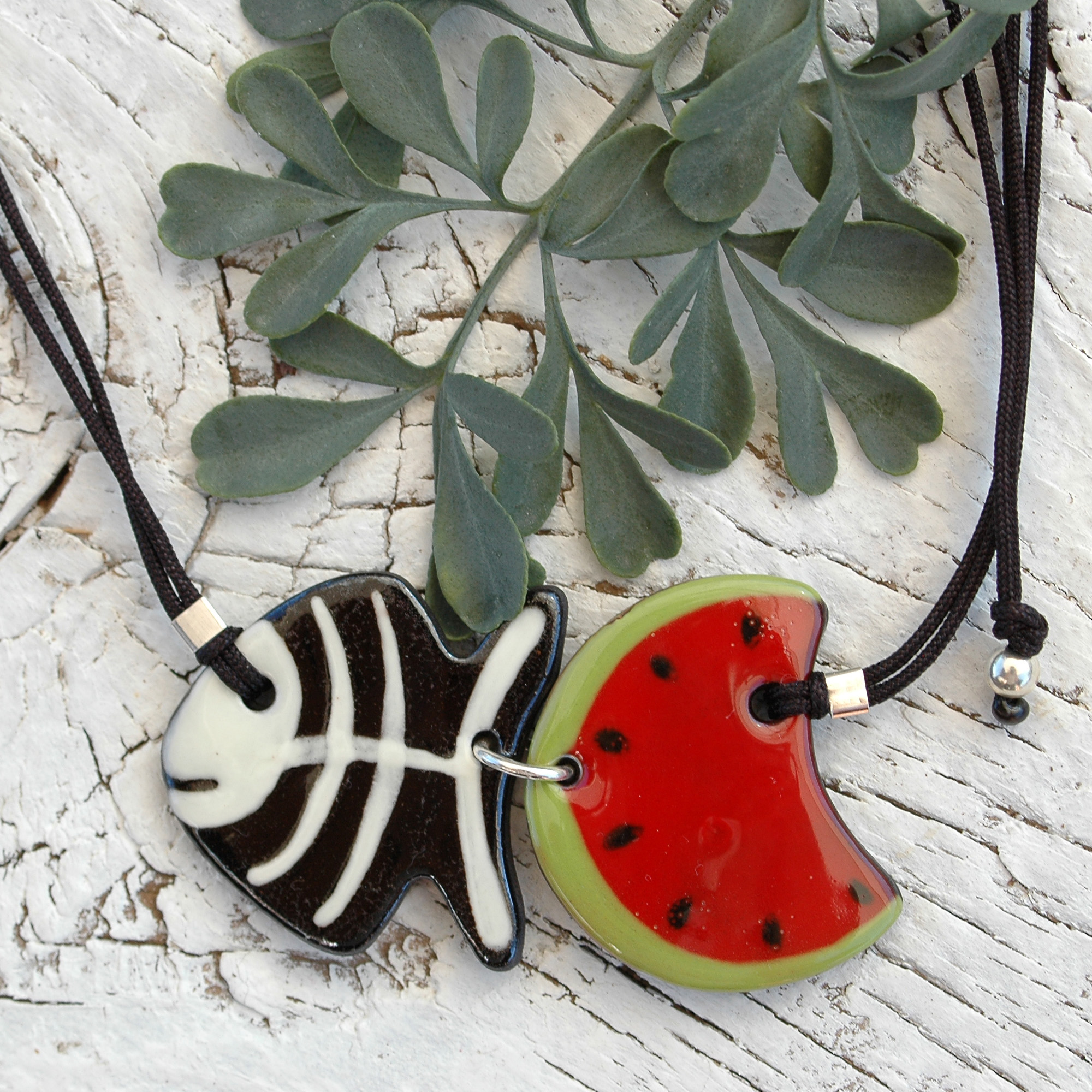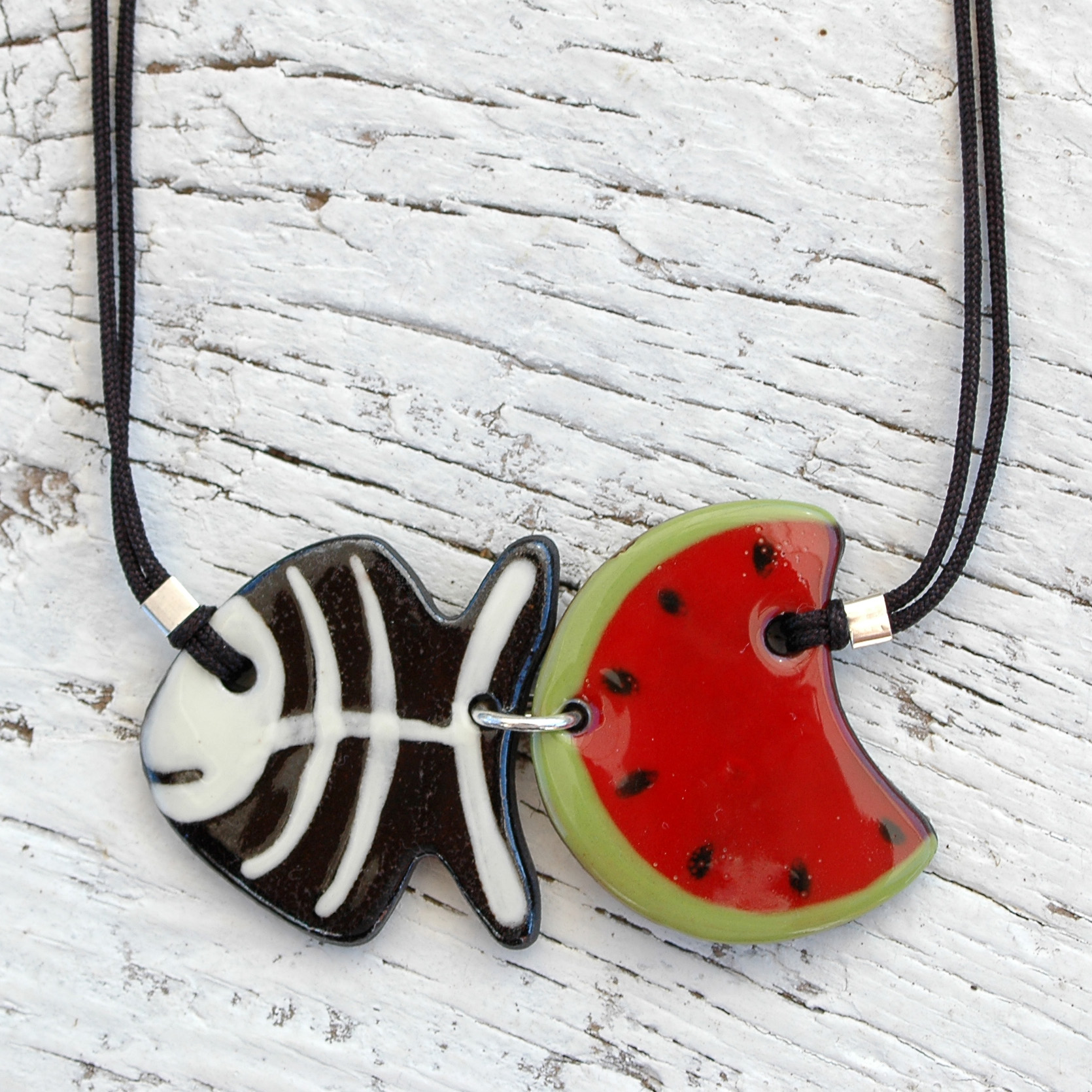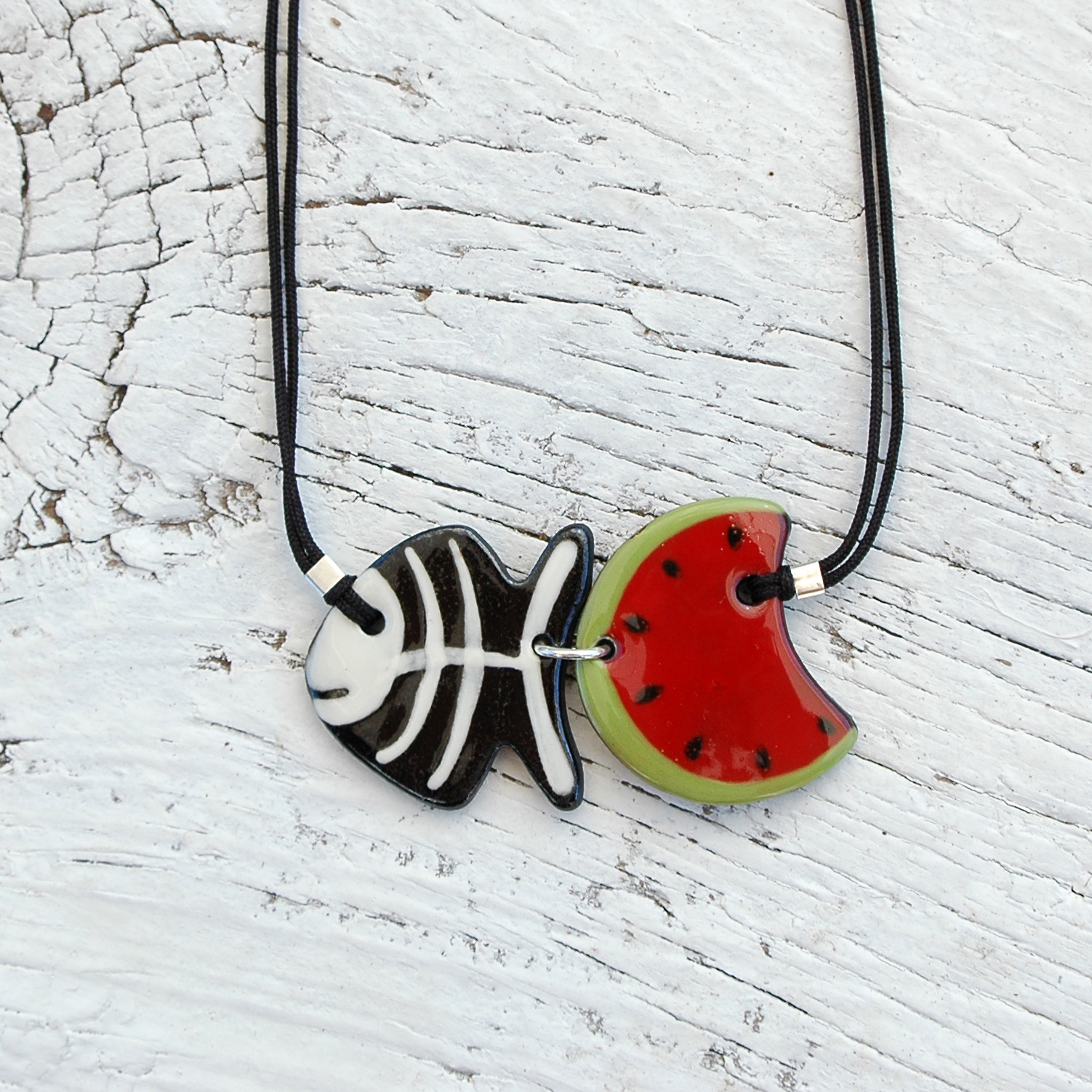 Esta hermosa gargantilla ajustable se verá original en tu escote. Es muy original combinar una rodaja de sandía y una espina de pescado, ¿te gusta? Ligero y cómodo, puedes llevarlo a diario porque su tamaño es ideal. Esta joya está formada por dos piezas de cerámica, ambas unidas por un anillo de plata de primera ley. El cordón está fabricado en naylon resistente y su cierre es regulable mediante una bola plateada que se desliza fácilmente. Cada extremo del cordón tiene una pequeña bola de plata hipoalergénica. Creativo, pintado a mano y muy exclusivo.