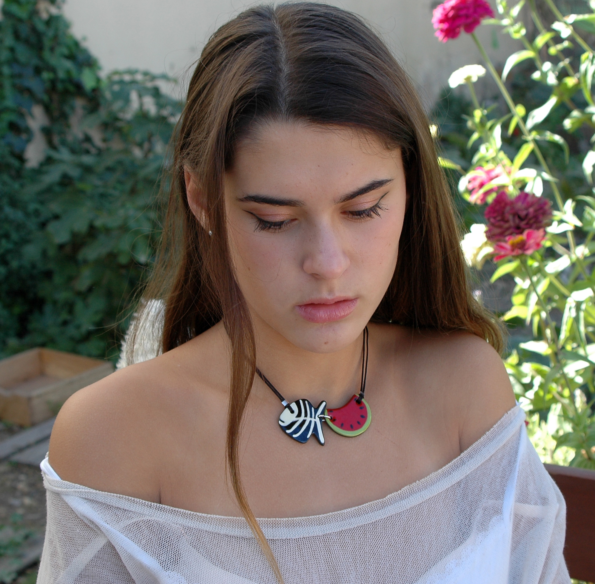 Utilizo barro negro y esmaltes cerámicos, hago cada pieza a mano y la pinto una a una, así cada una tiene pequeñas diferencias y particularidades, siendo piezas únicas. Este collar está hecho a mano con materiales de alta calidad.