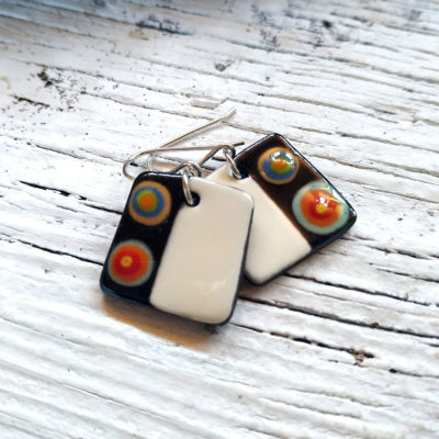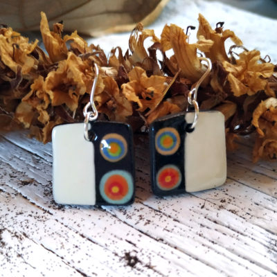 Esta joya está equilibrada en el color y la forma, pues una mitad está decorada con motivos psicodélicos redondos (que contrastan con la forma cuadrada del pendiente) y la otra mitad está decorada en color blanco liso -minimalista- que apacigua y equilibra toda la información. De este modo, estos creativos pendientes combinan inteligencia, delicadeza y generosidad. Fáciles de combinar, ligeros y livianos… no te cansarás de utilizar todos los días. Una excelente pieza de cerámica en tu rostro, magnética y llena de magia.