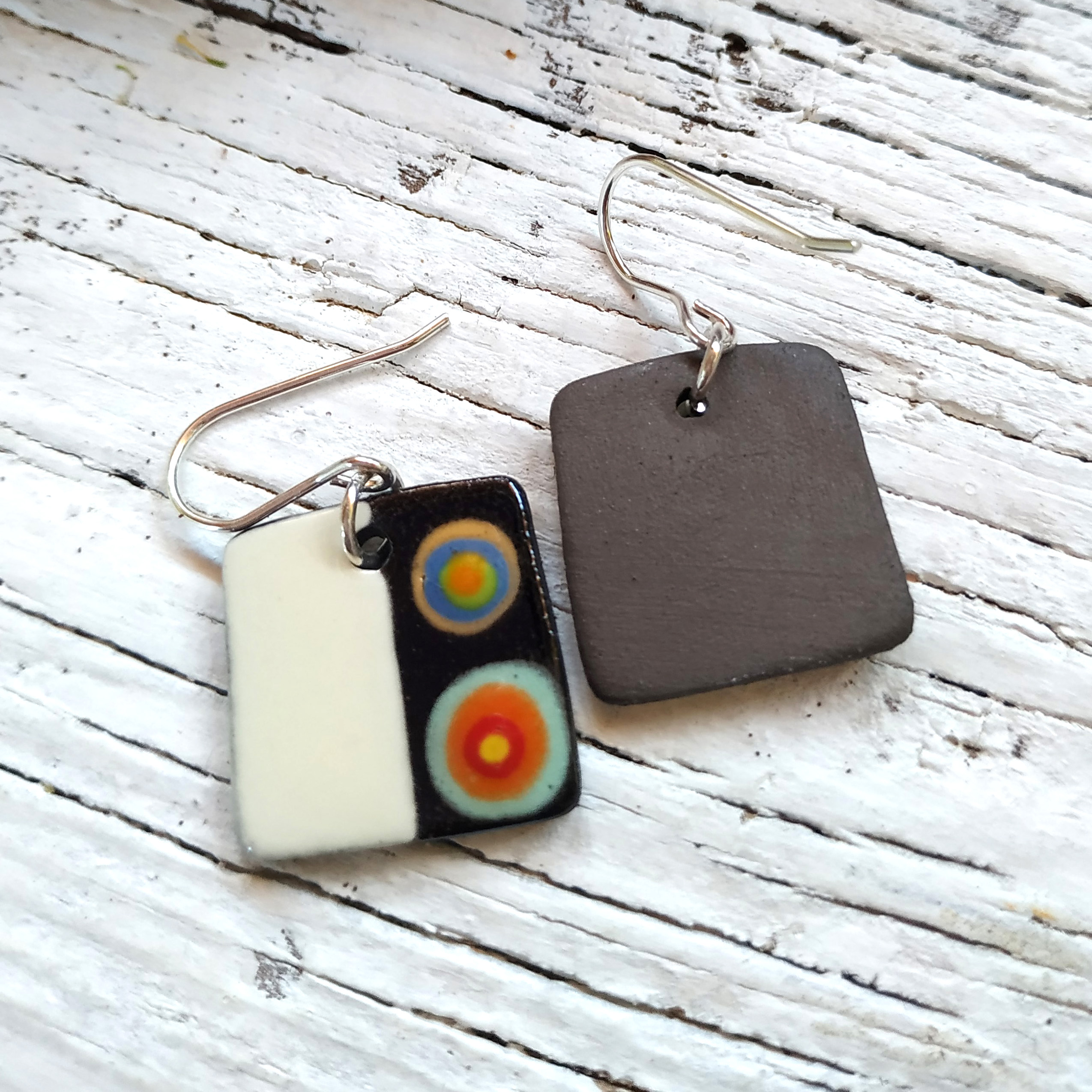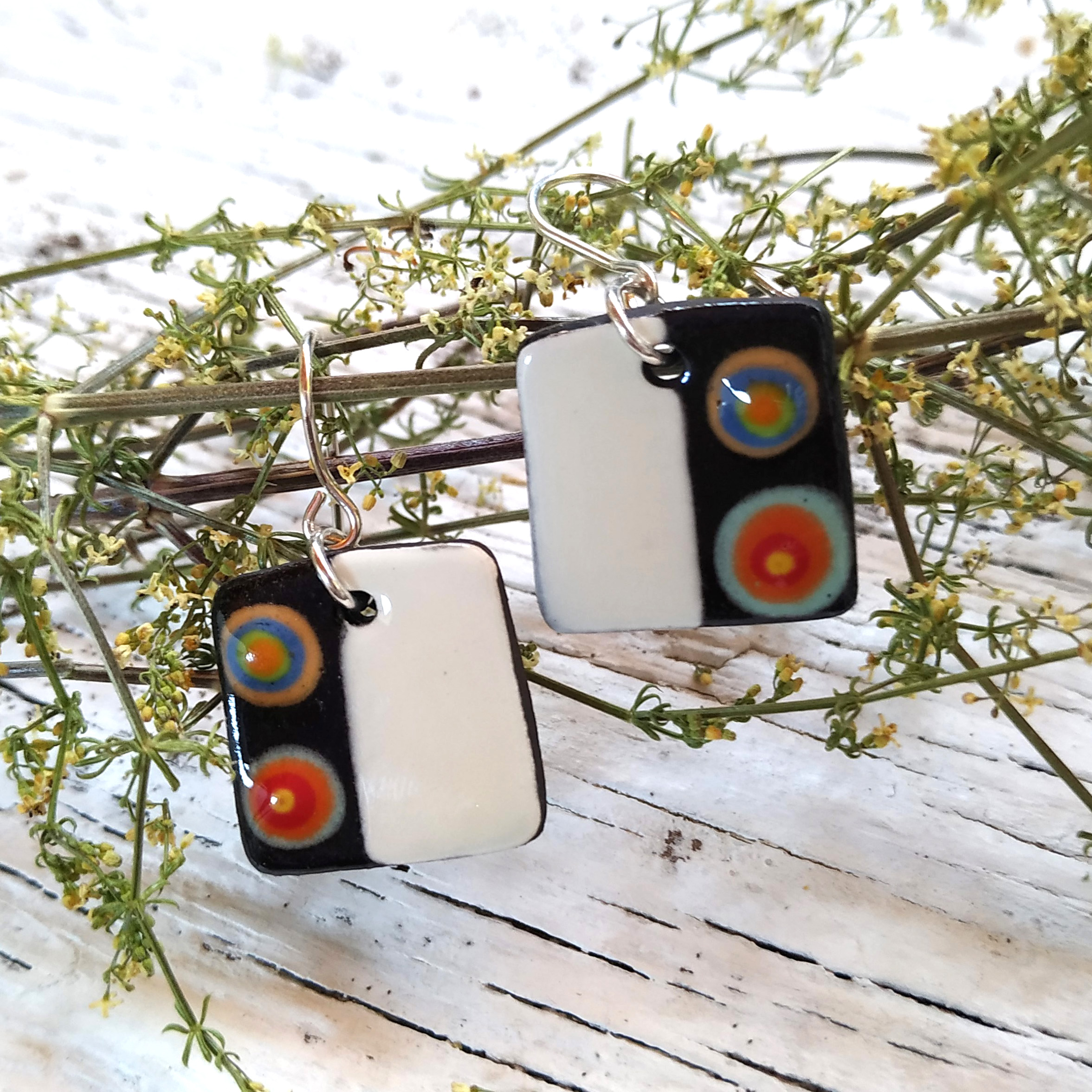 Esta joya está equilibrada en el color y la forma, pues una mitad está decorada con motivos psicodélicos redondos (que contrastan con la forma cuadrada del pendiente) y la otra mitad está decorada en color blanco liso -minimalista- que apacigua y equilibra toda la información. De este modo, estos creativos pendientes combinan inteligencia, delicadeza y generosidad. Fáciles de combinar, ligeros y livianos… no te cansarás de utilizar todos los días. Una excelente pieza de cerámica en tu rostro, magnética y llena de magia.
