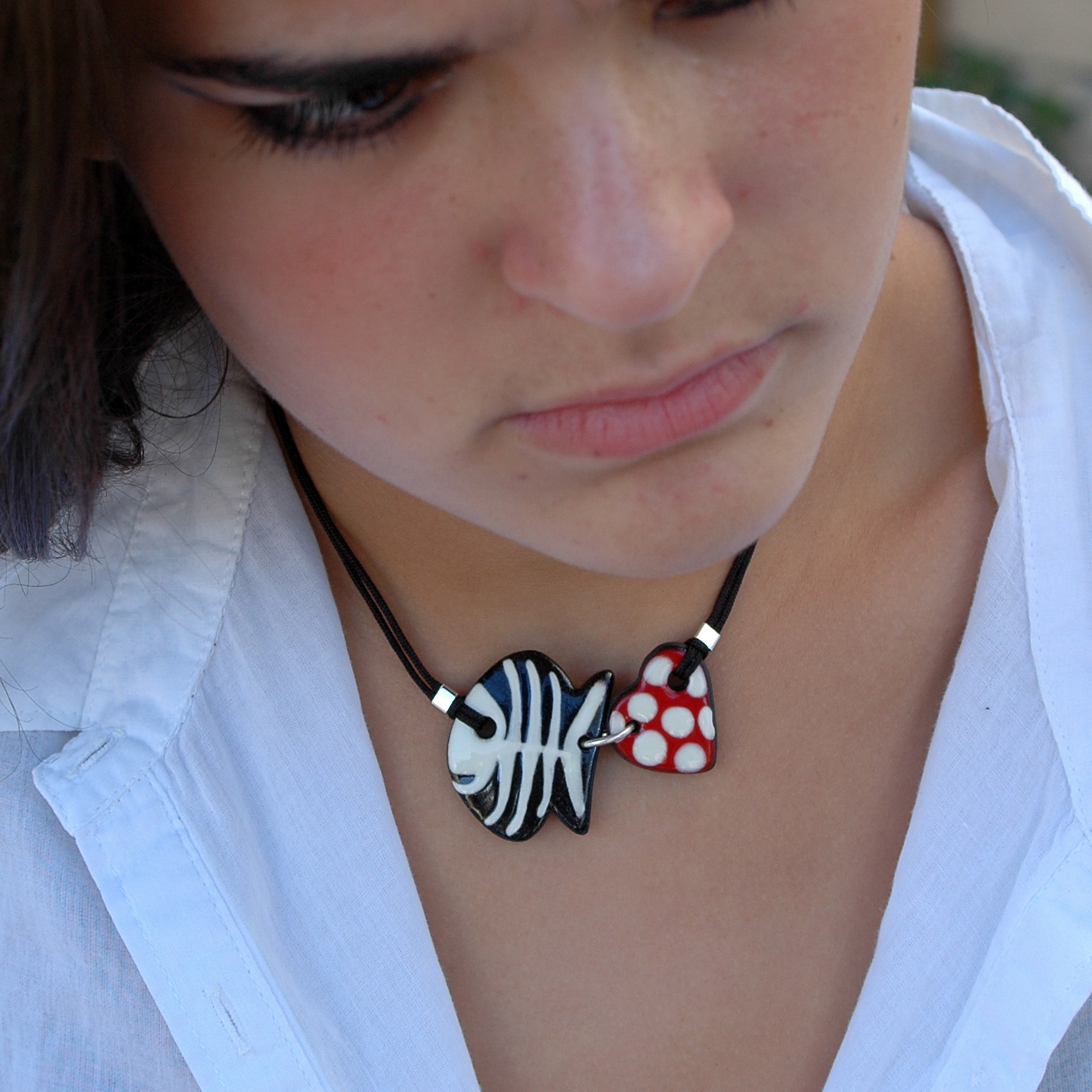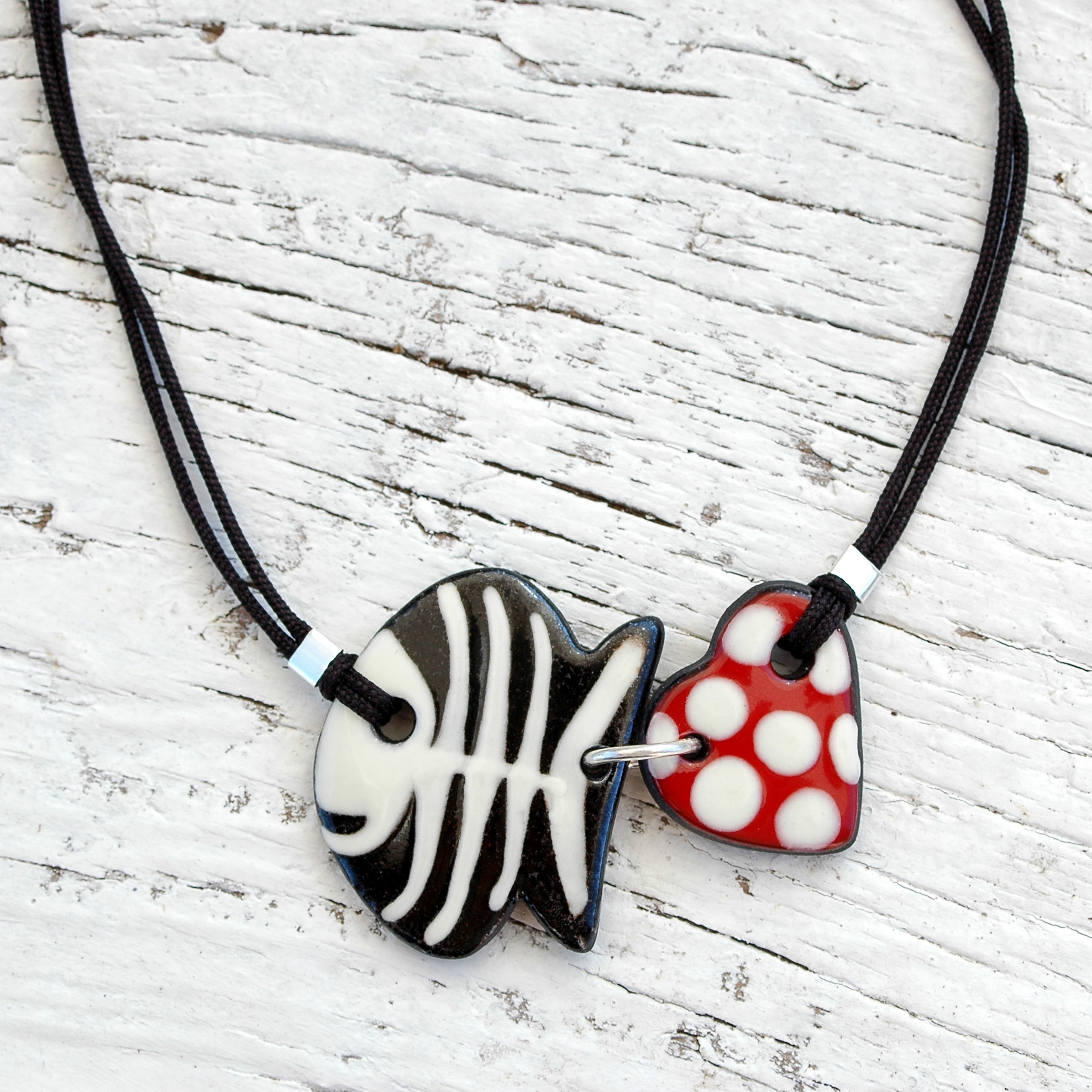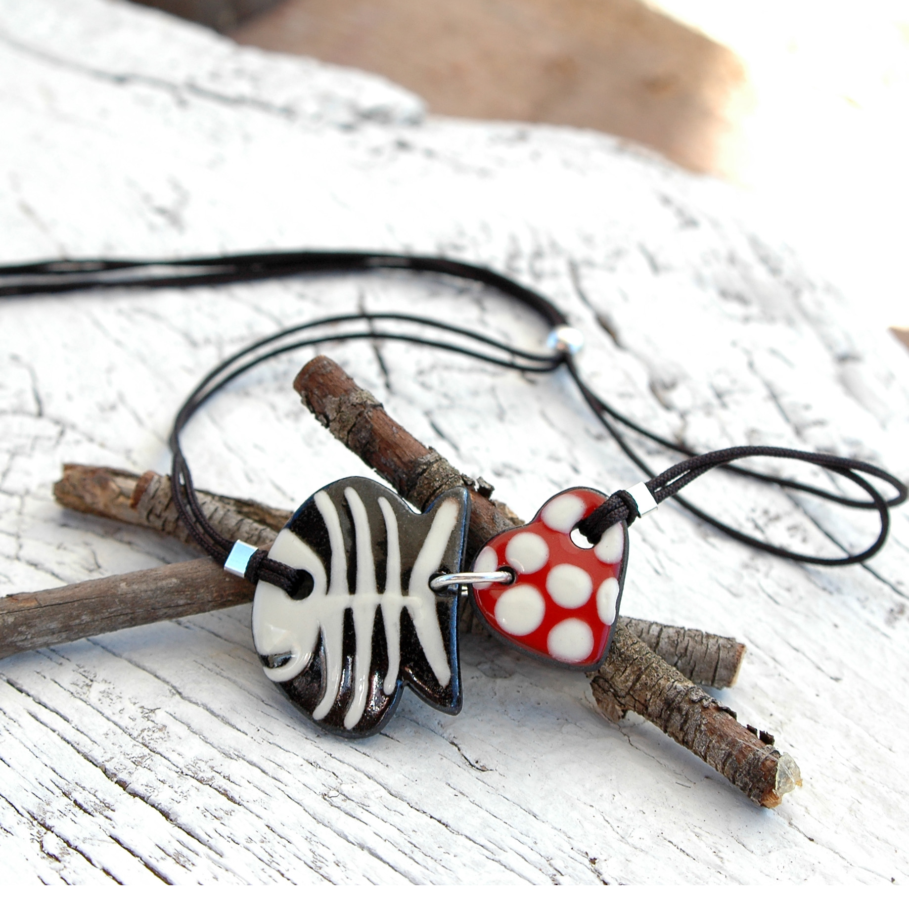 Esta divertida gargantilla ajustable se verá atrevida en tu escote. Es muy original combinar una raspa de pez con un corazón rojo y lunares blancos, ¿te gusta? Ligero y cómodo, puedes usarlo a diario porque su tamaño es ideal. Esta joya está formada por dos piezas de cerámica, ambas unidas por una anilla de plata de primera ley. El cordón está fabricado en nailon resistente y su cierre es regulable mediante una bola de plata que se desliza fácilmente. Cada extremo del cordón tiene una pequeña bolita de plata hipoalergénica. Creativo, pintado a mano y muy exclusivo. ¡¡Atrévete a lucirlo!! Una pieza única y mediterránea llena de amor. Está pintado y elaborado a mano en mi taller.